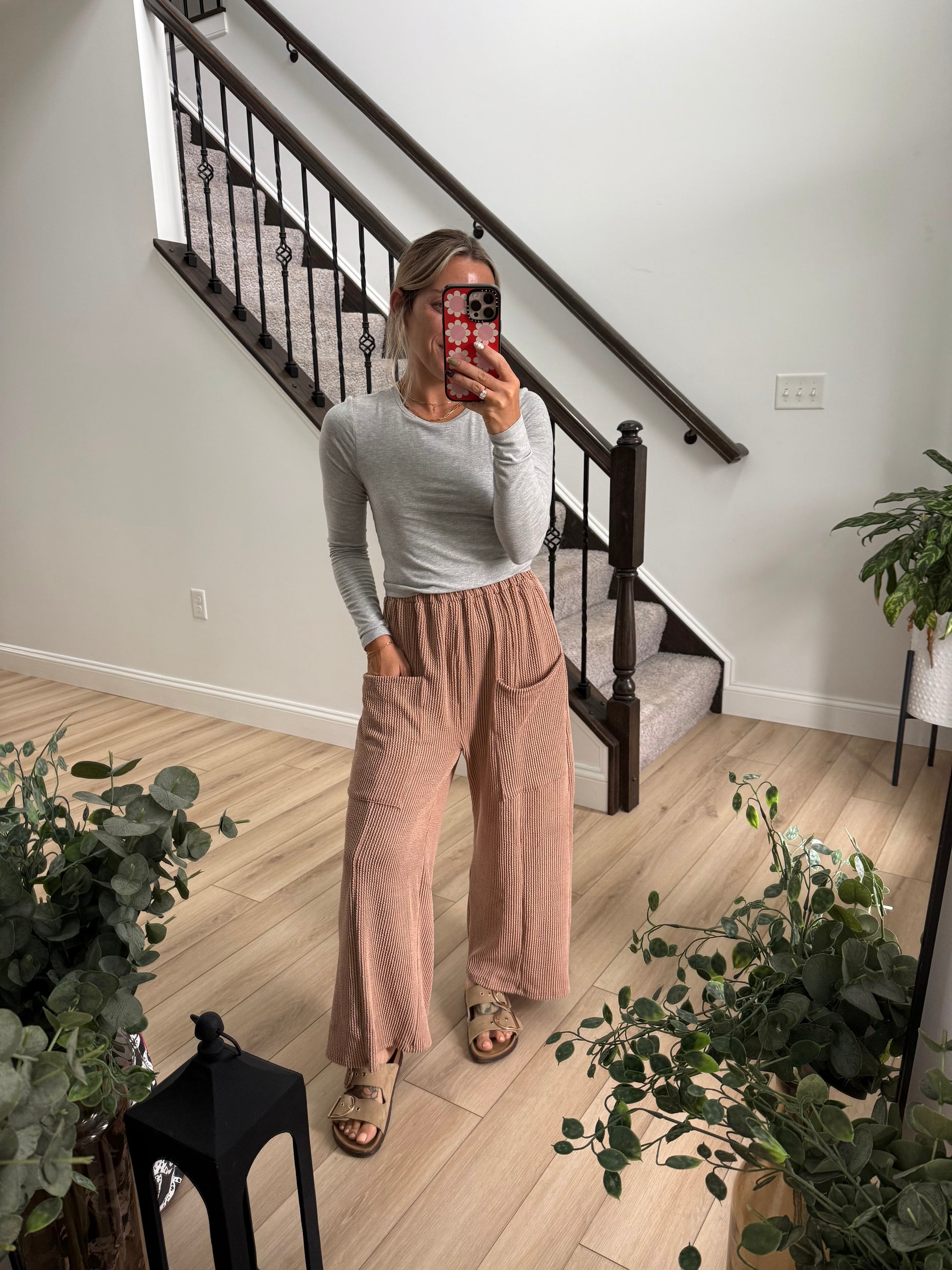 Wide leg, ribbed pant in a slight cropped length (27” inseam). Elastic waist and front pocket details.