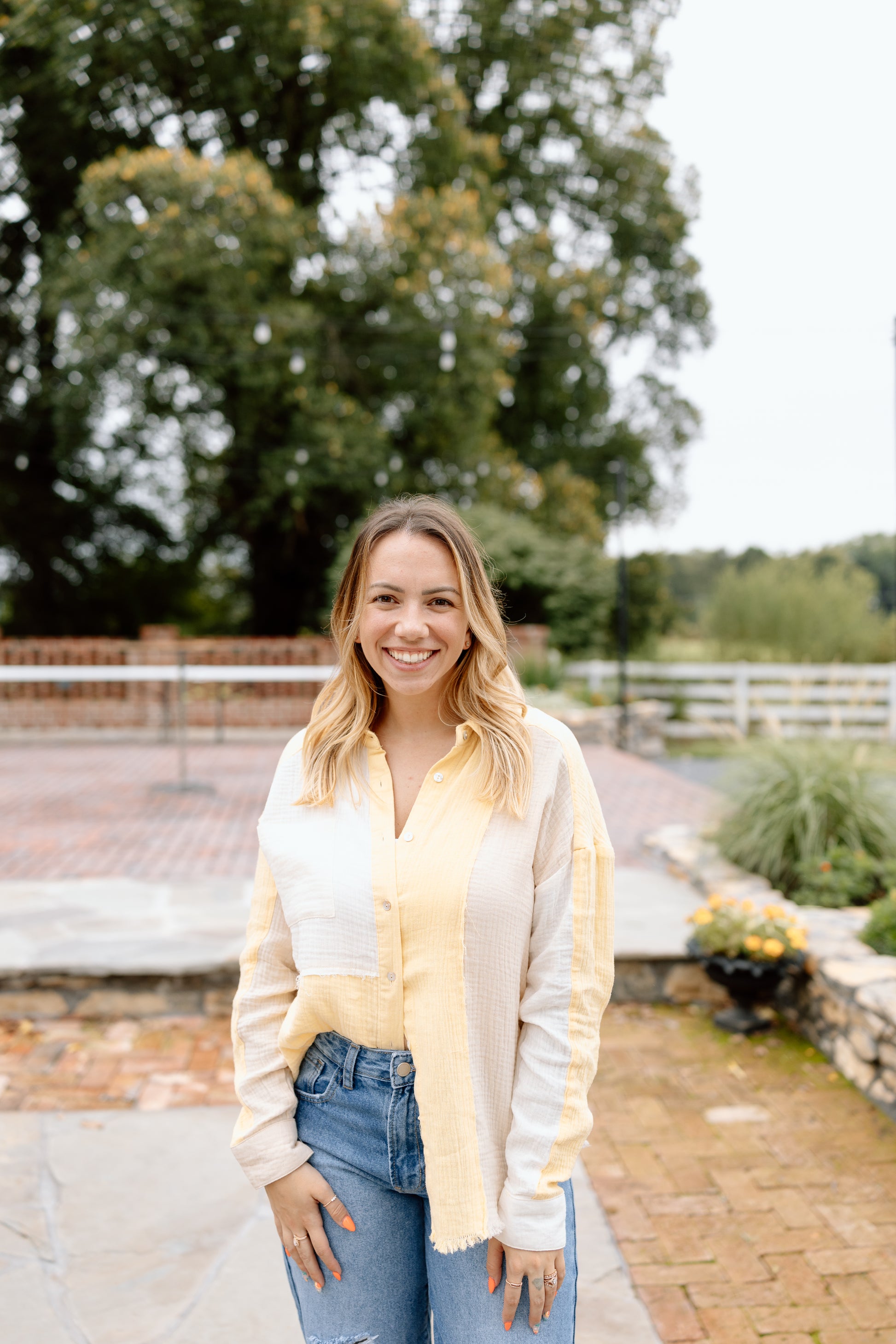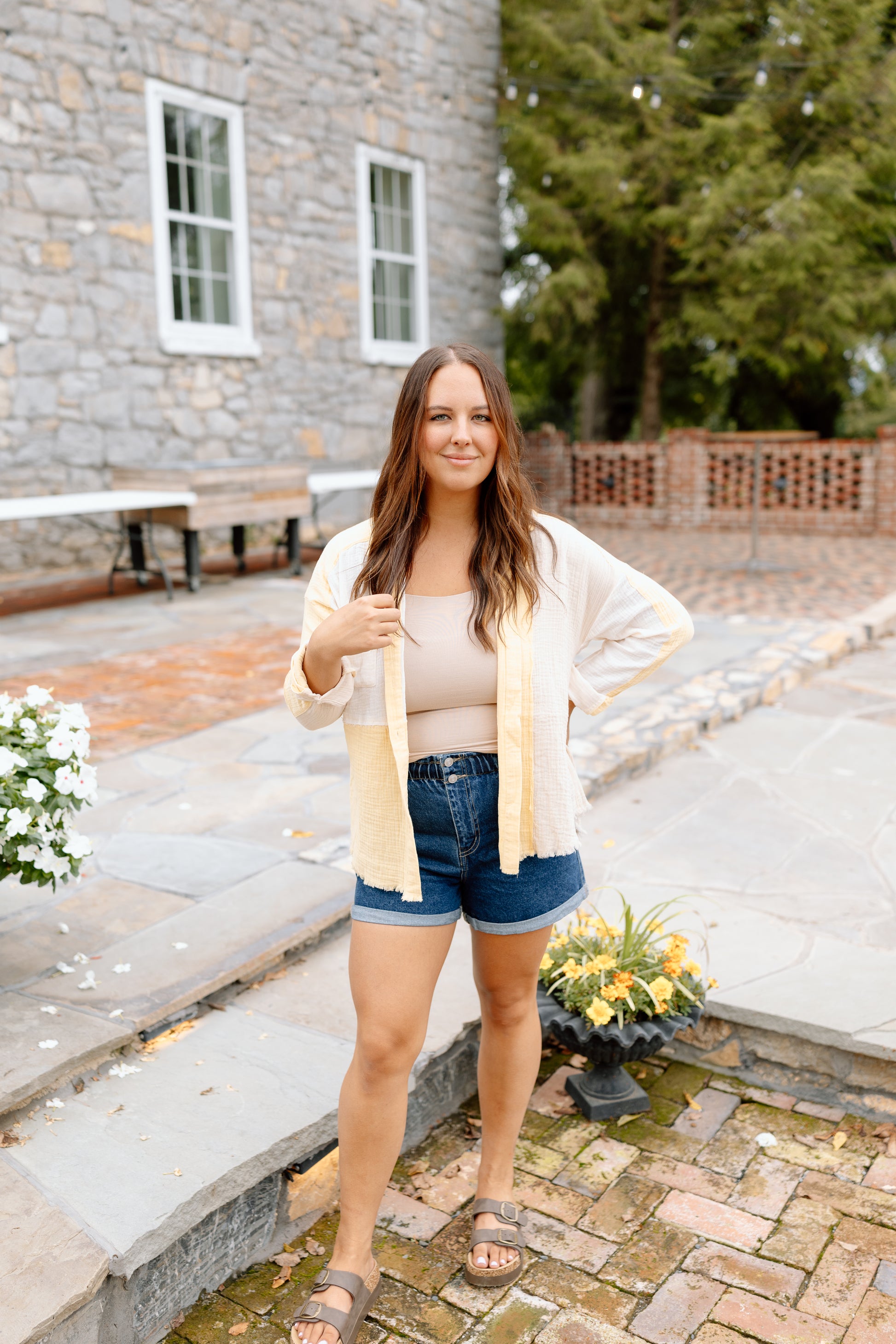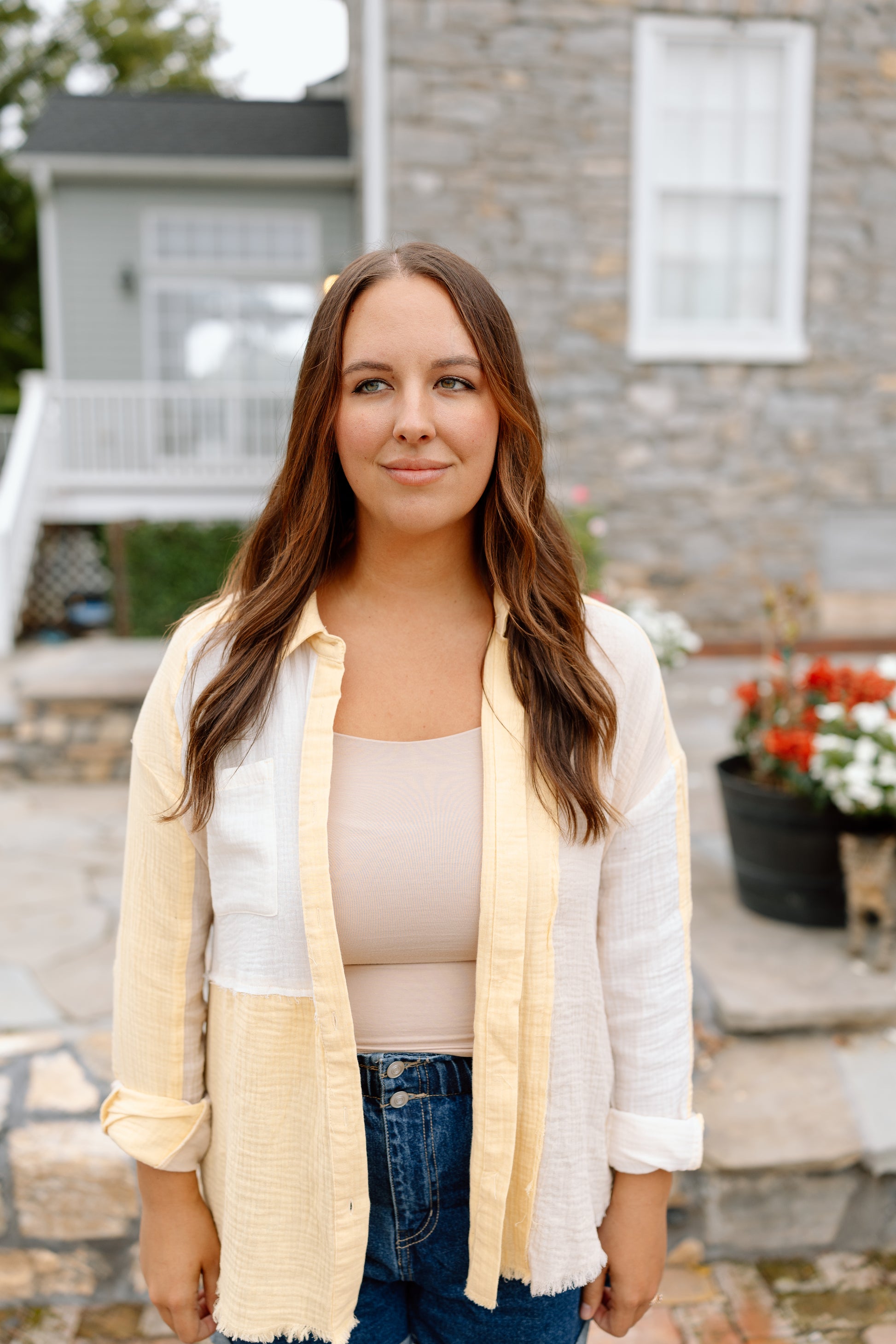 Relaxed fit, light weight gauze top. Pale yellow, white and cream details. Front buttons.