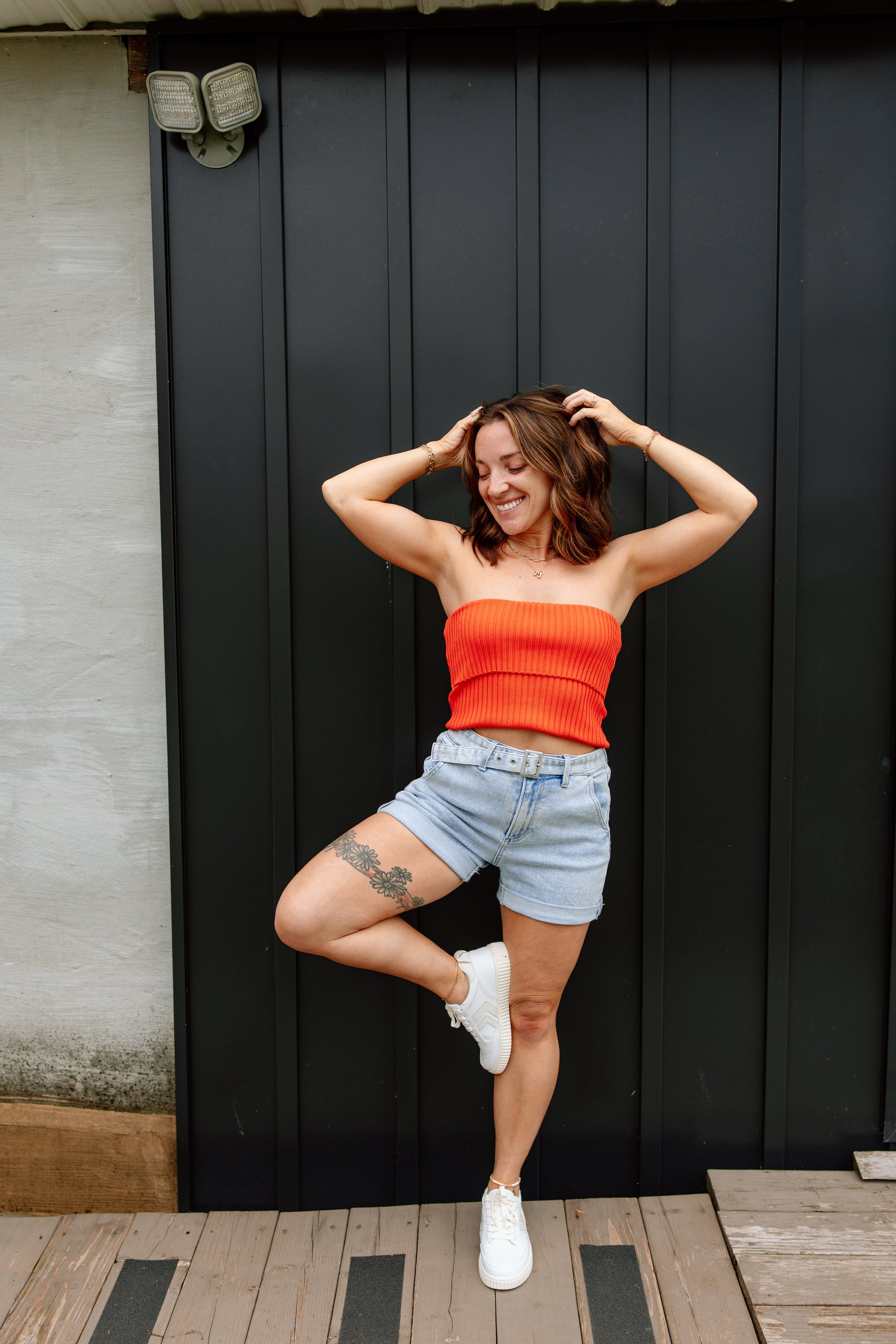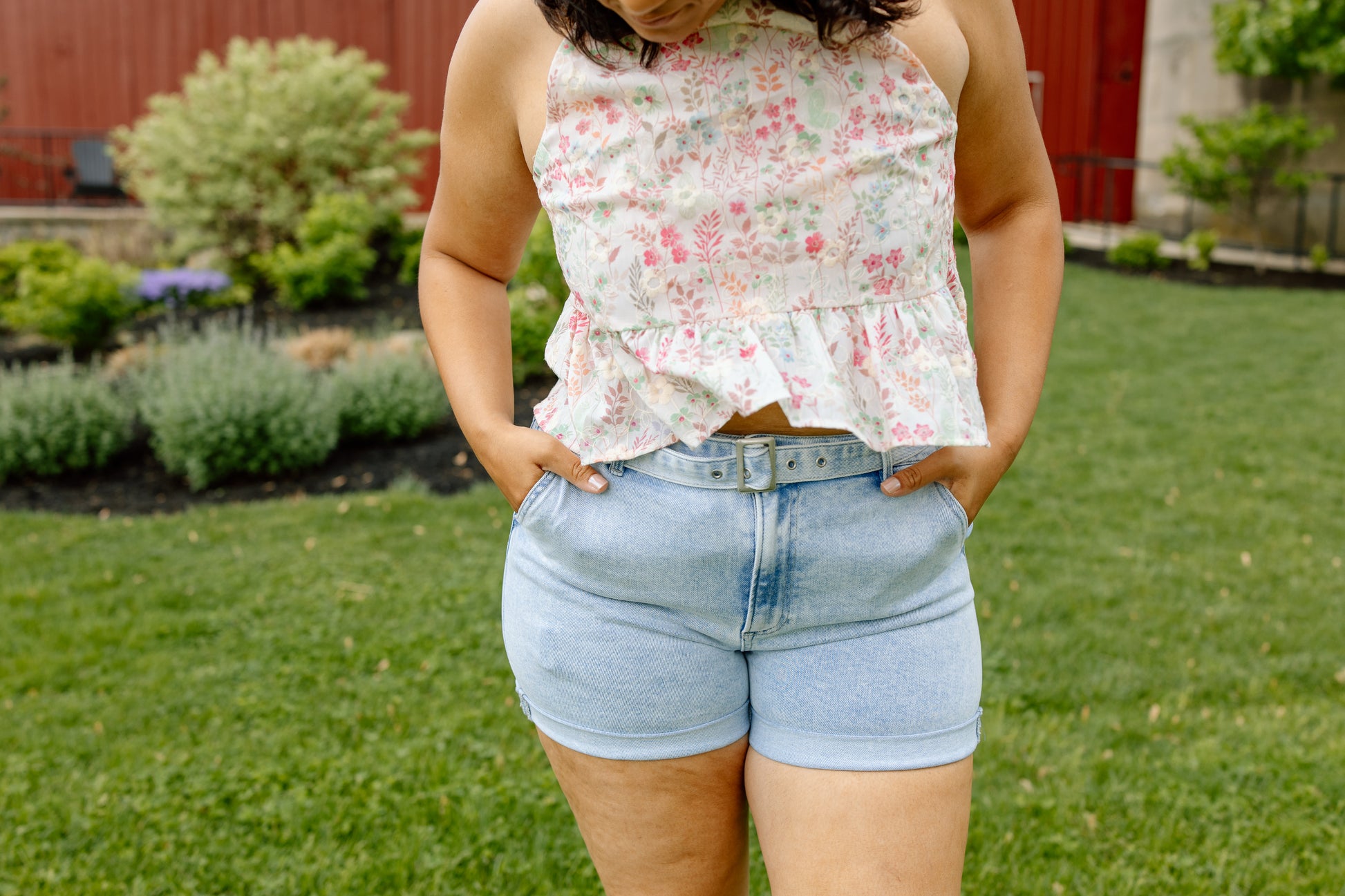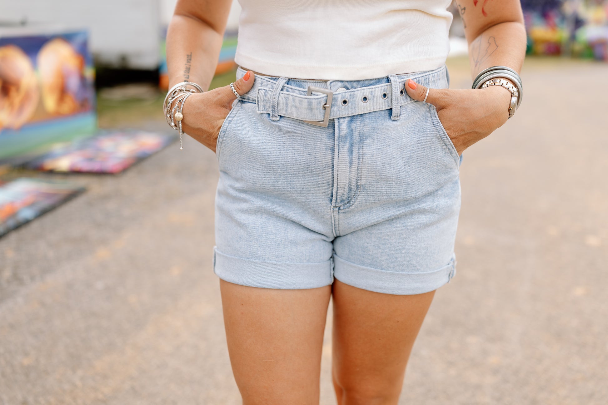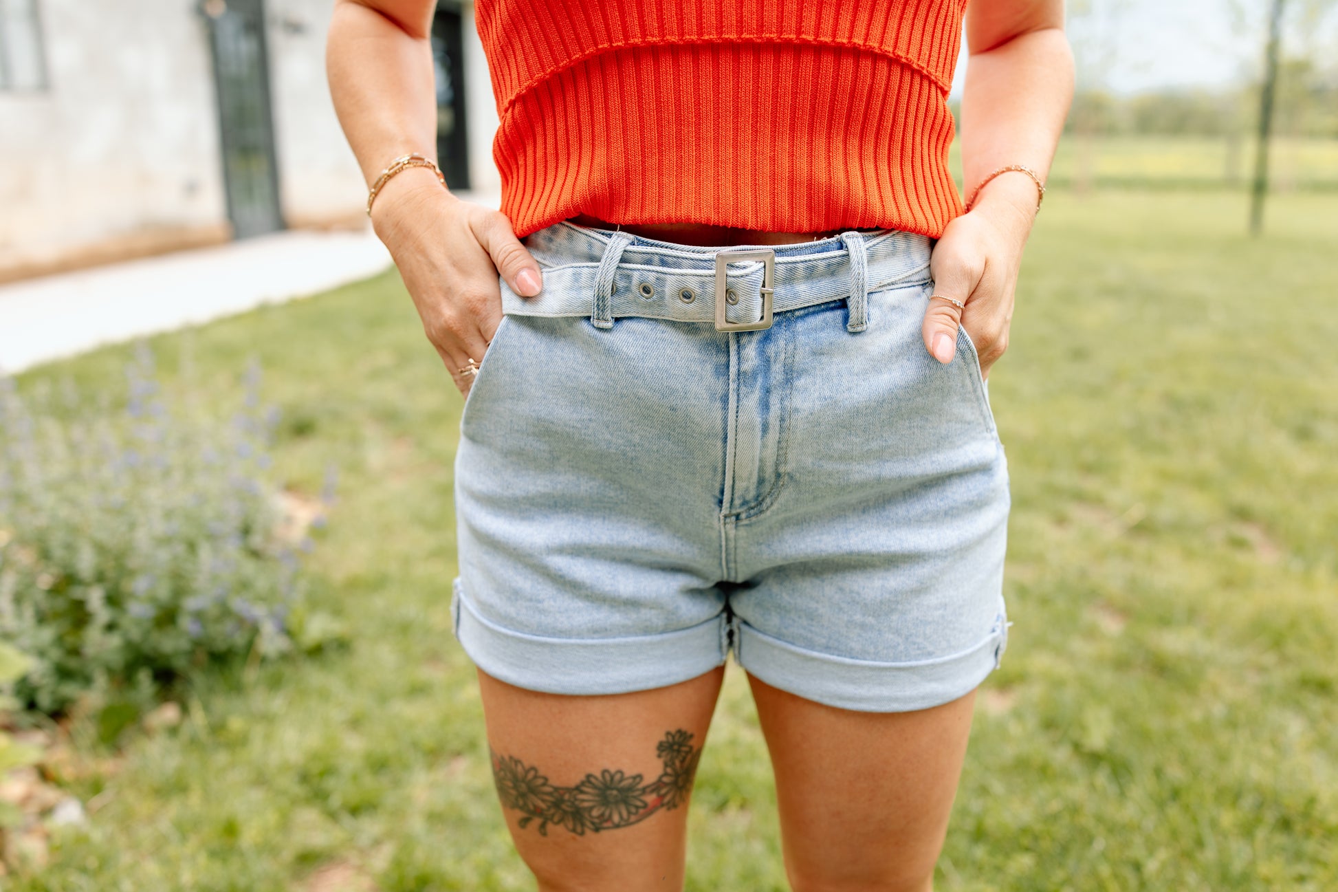 High rise belted shorts, belt is removable. Rise 10 1/2", inseam 3 1/2".