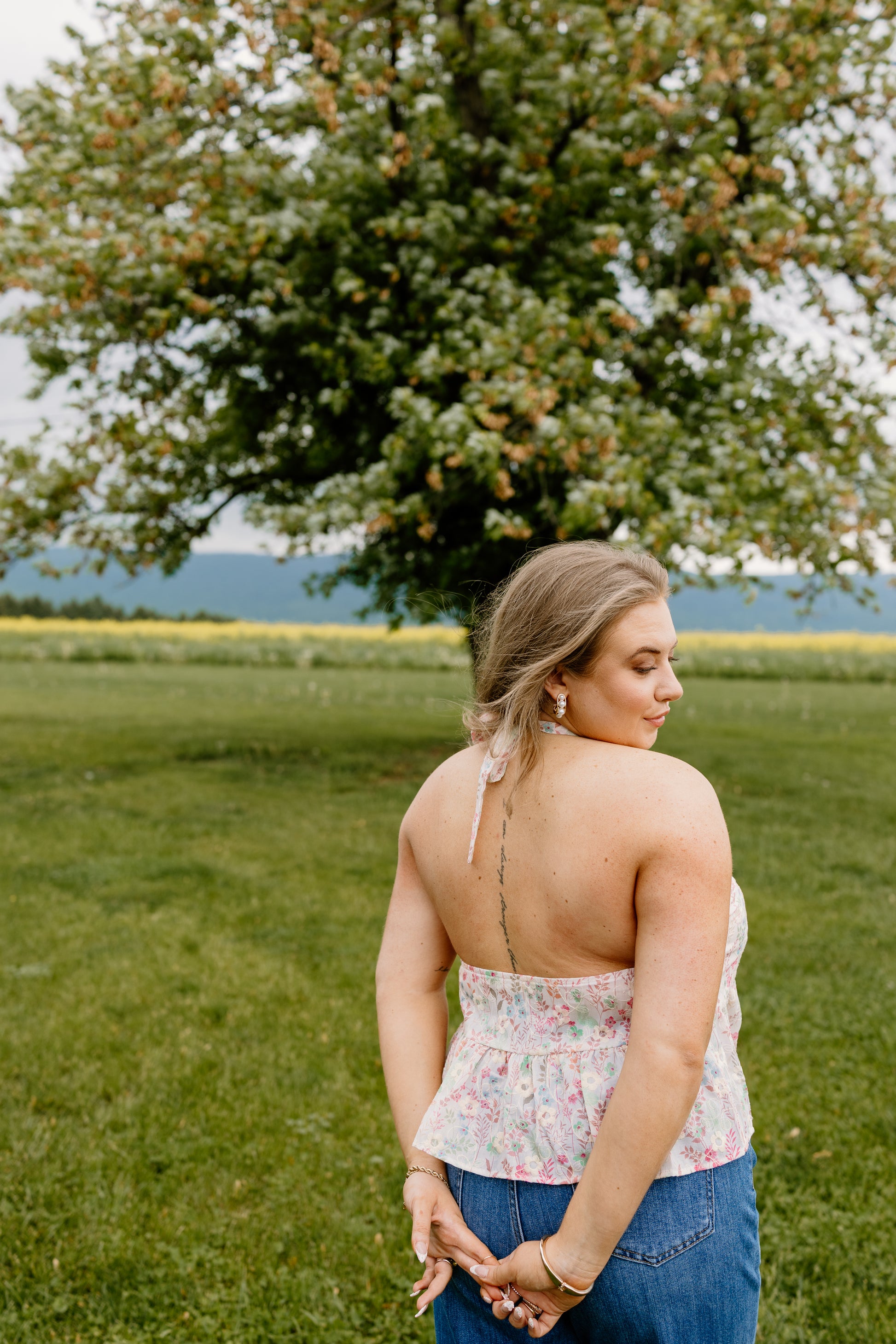 Embroidered all over print. Adjustable tie back halter. Ruffle hem for a feminine finish. Open back! True to size.