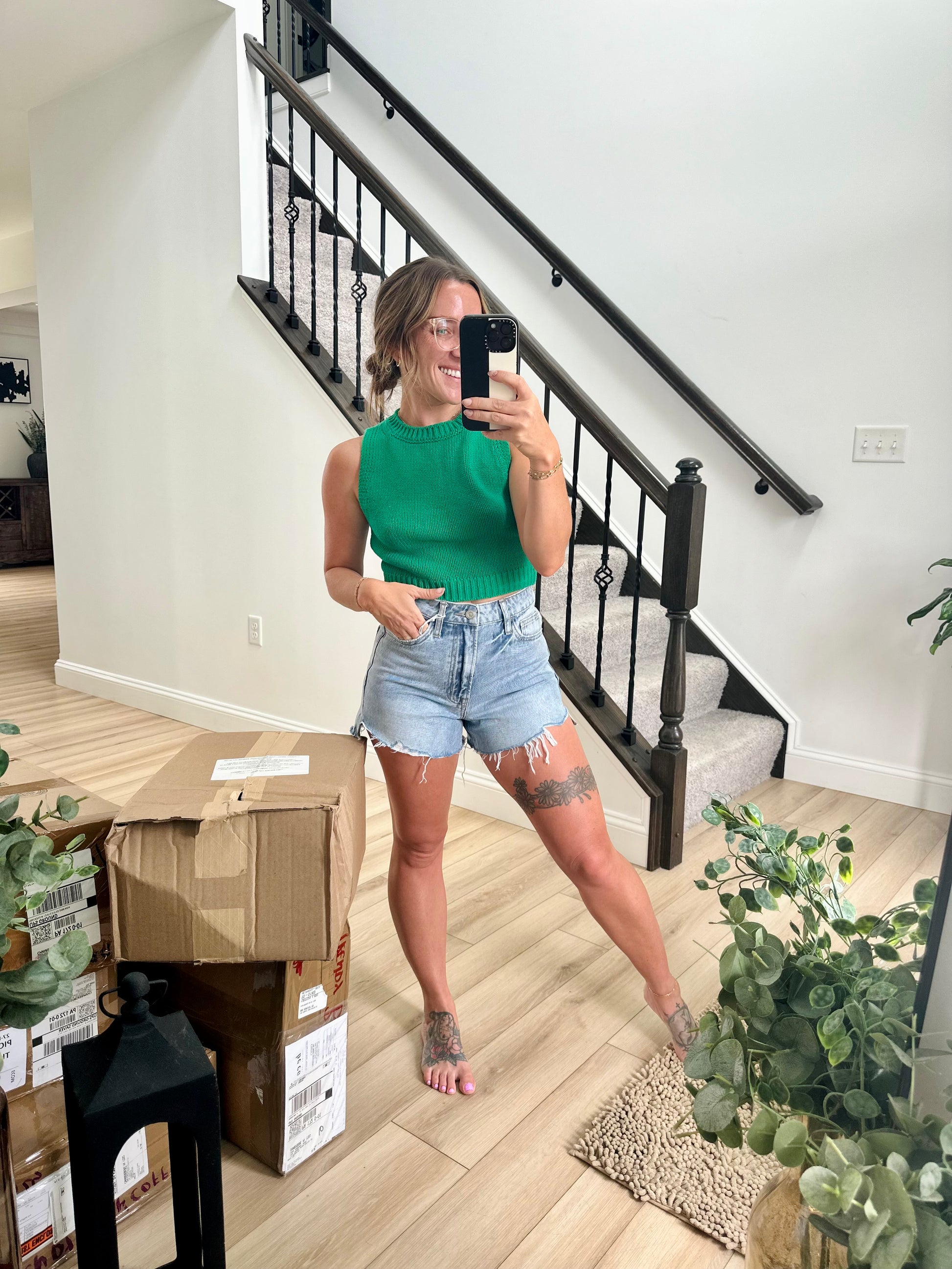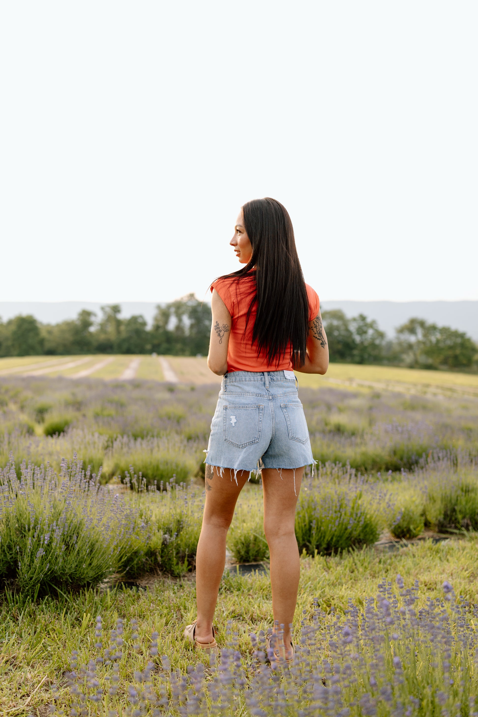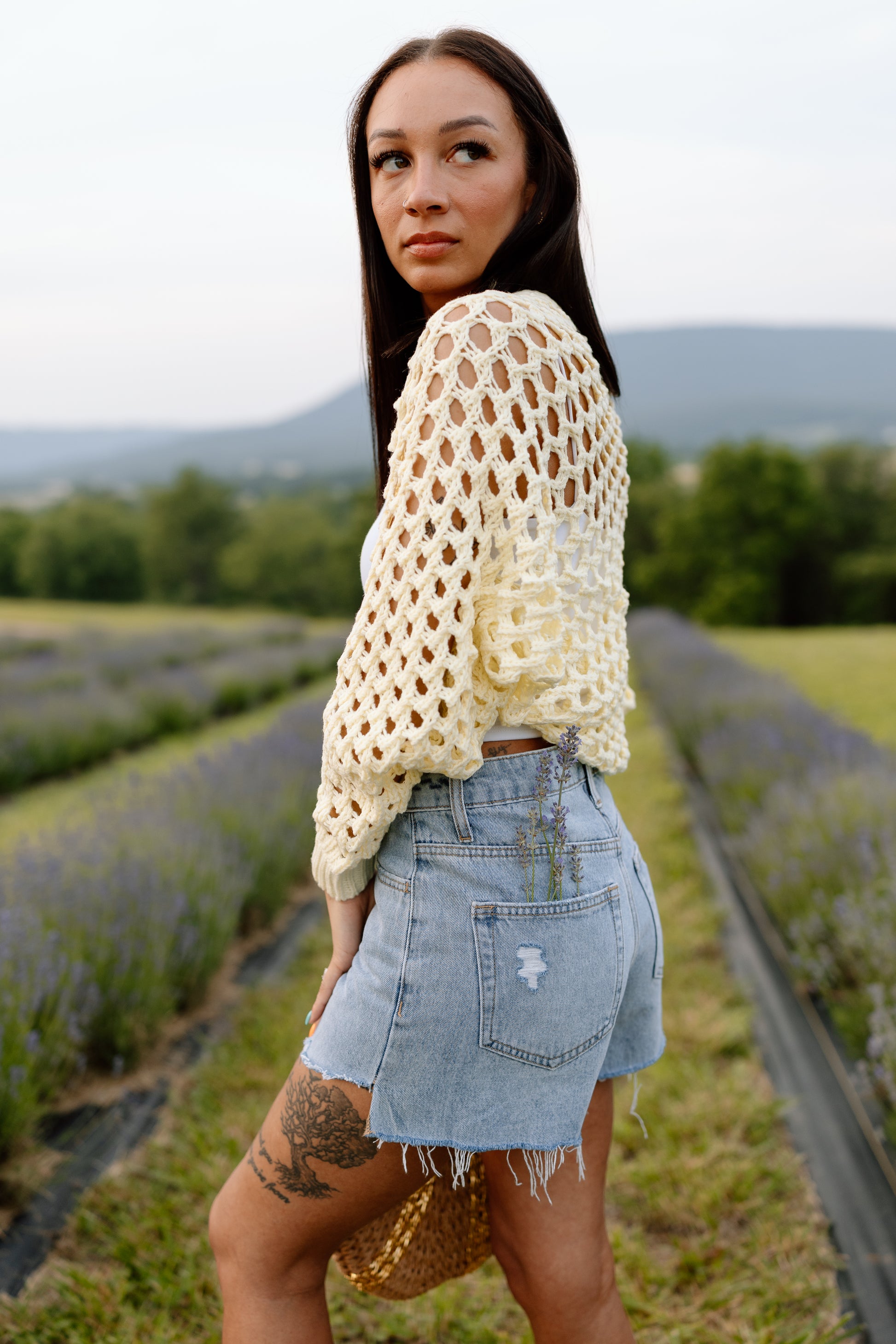 Rigid denim with a comfort touch. High rise, zipper fly, distressed design. Inseam 3 1/2". A denim short that keeps it's shape but is also meal approved and easy to sit in (IYKYK).