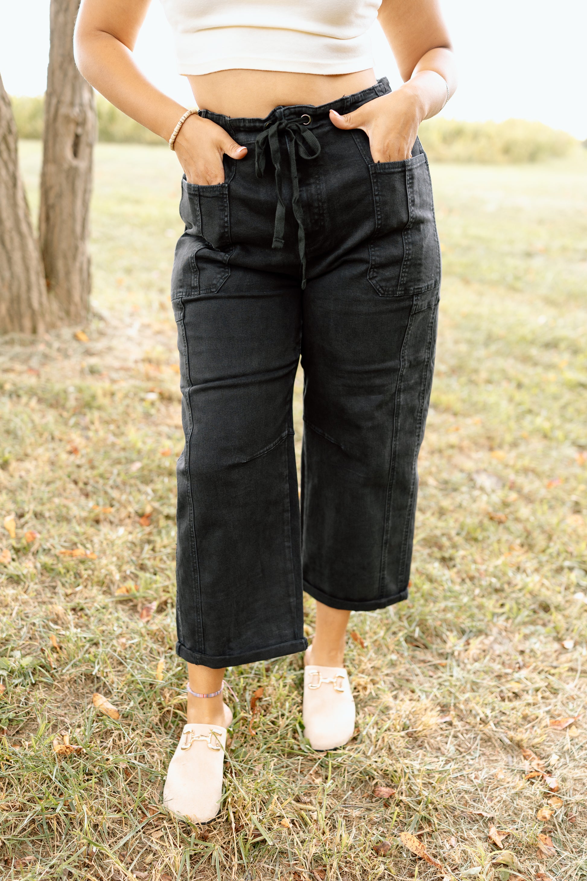 Stretchy barrel pant with tie detail. Elastic waist detail on back, tie front for closure. 28” inseam not cuffed, 26.5” inseam cuffed. Front pockets. And did I say STRETCHY! A pair of denim you feel confident in before AND after dinner! 0/24, 1/25, 3/26, 5/27, 7/28, 9/29, 11/30, 13/31, 15/32, 1X 14/16, 2X 16/18, 3X 18/20.