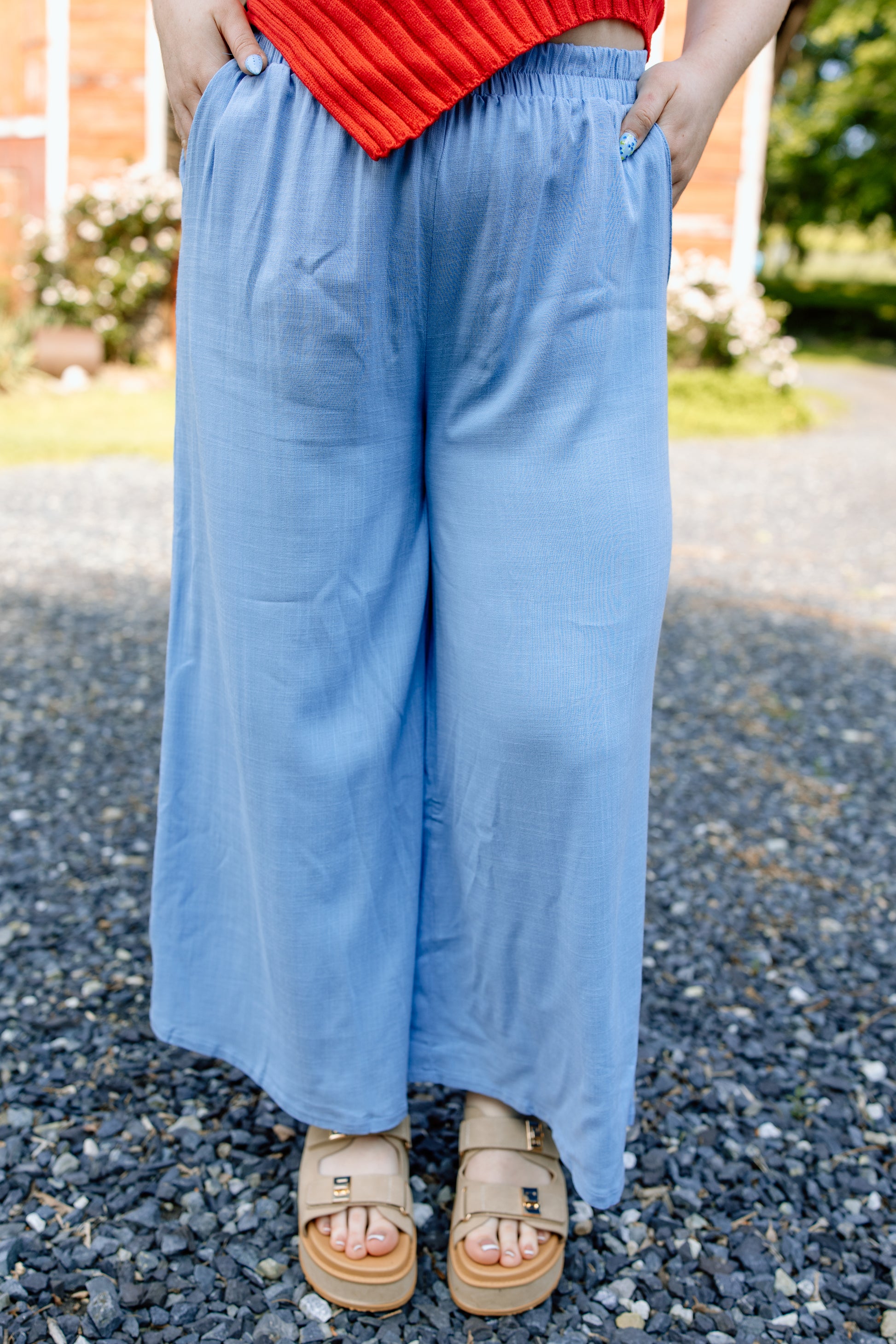 Elastic waist, pocket detail. Linen material to keep the bottoms light and airy but add in a woven blend and these pants are seamless (not see through). 27" inseam.