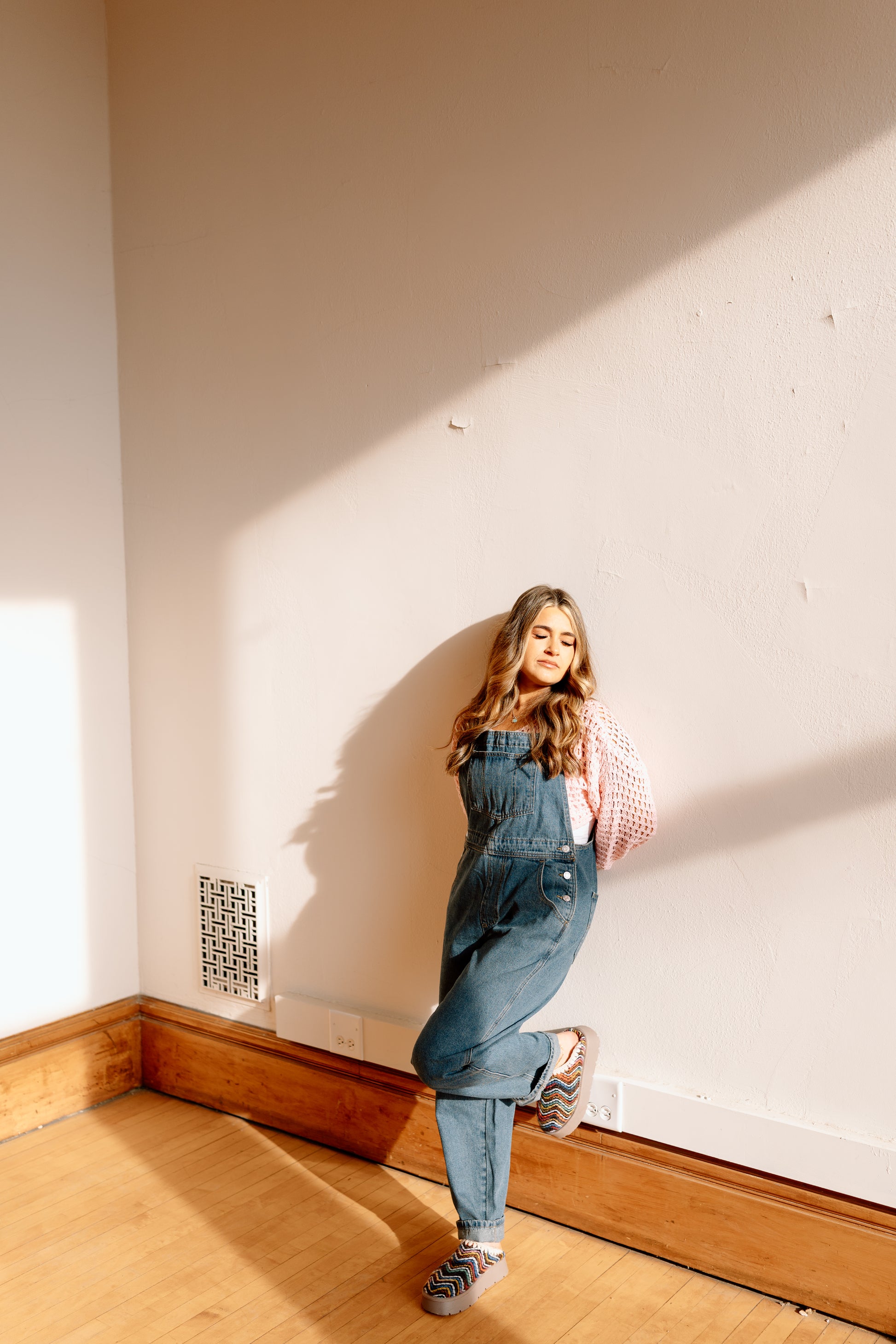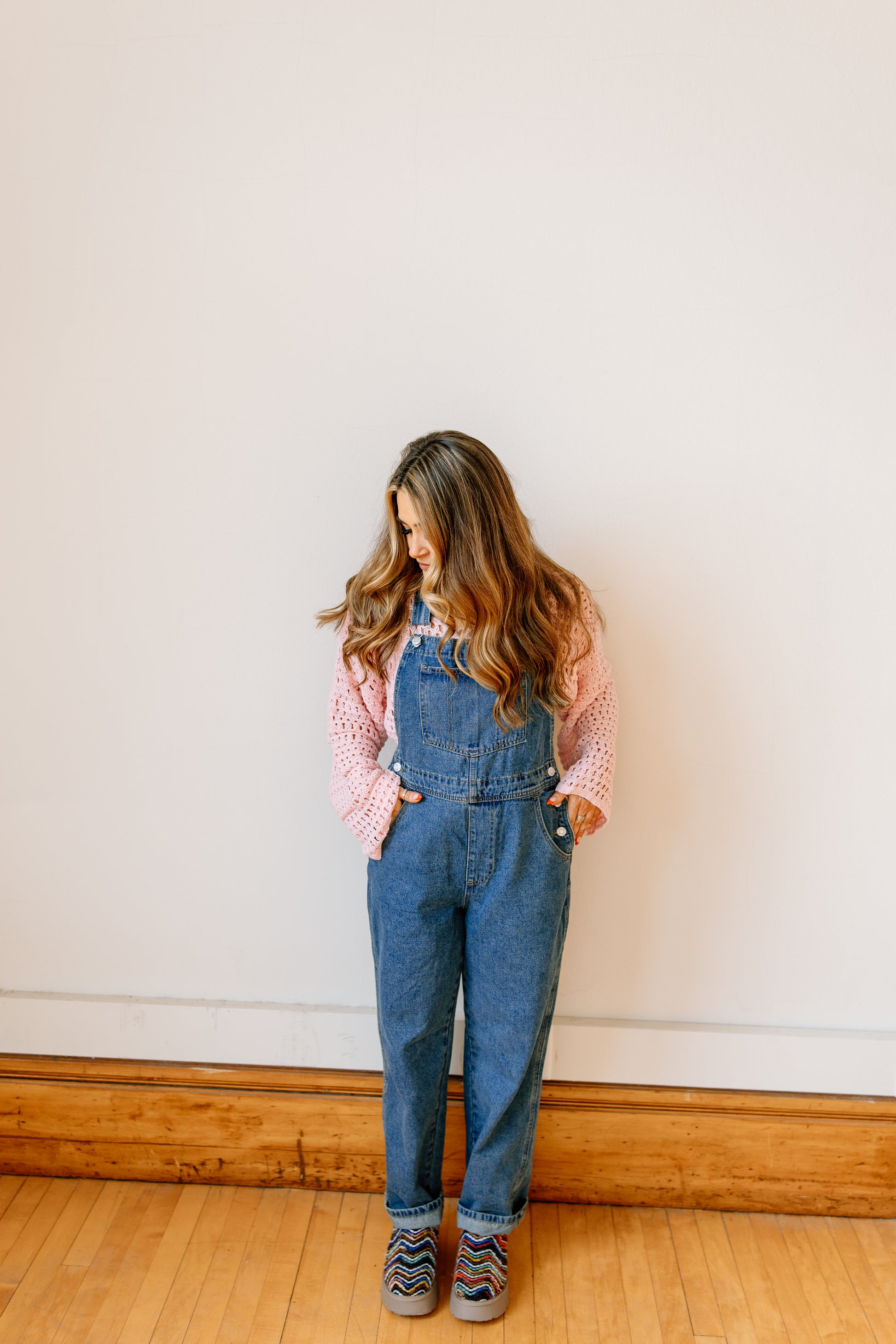 A crochet knit shrug sweater. Cropped fit. This layered >>> A relaxed, true to size fit. A beautiful pale pink to wear now and take into the Spring.