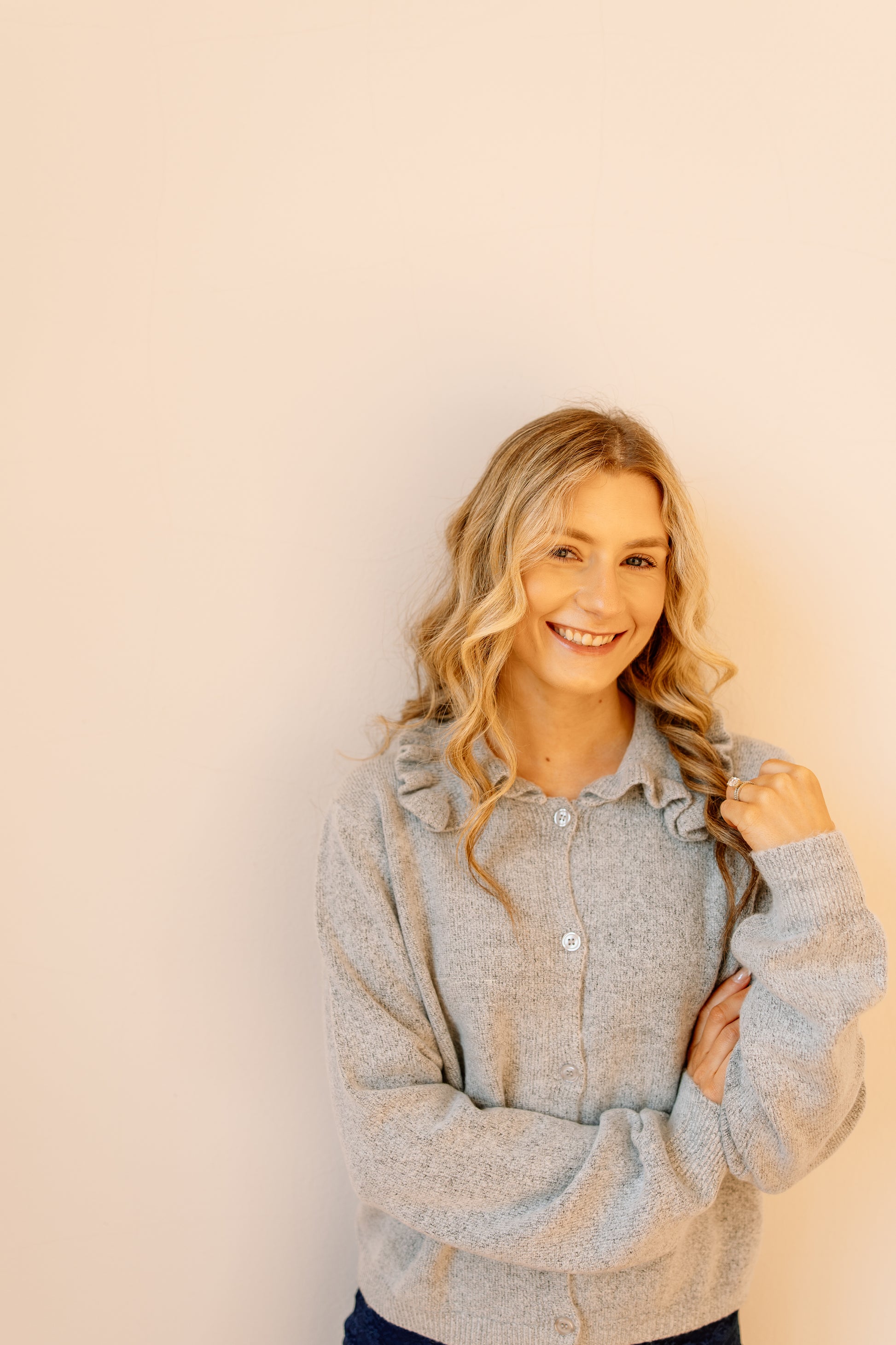 Ruffle collar detail, neutral grey in tone. Butter soft knit, so that you'll never want to take it off. Relaxed fit.