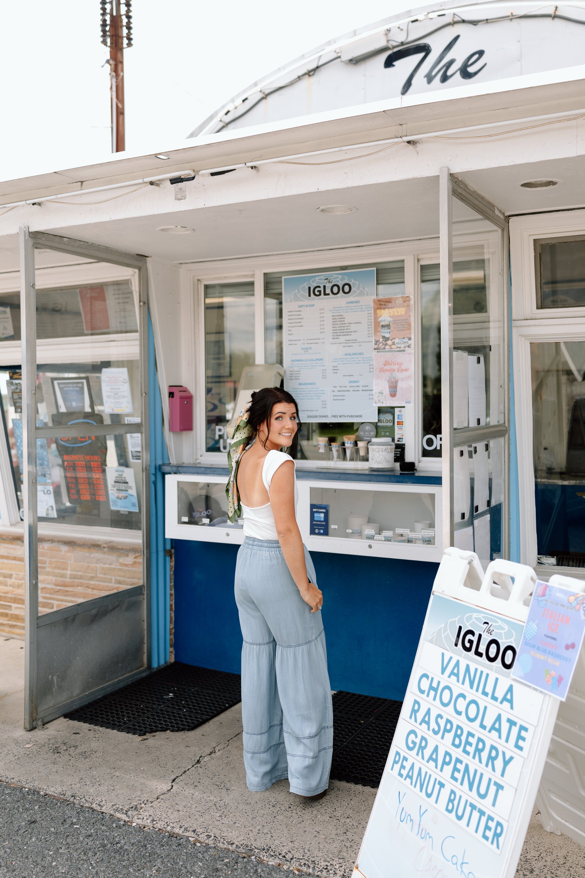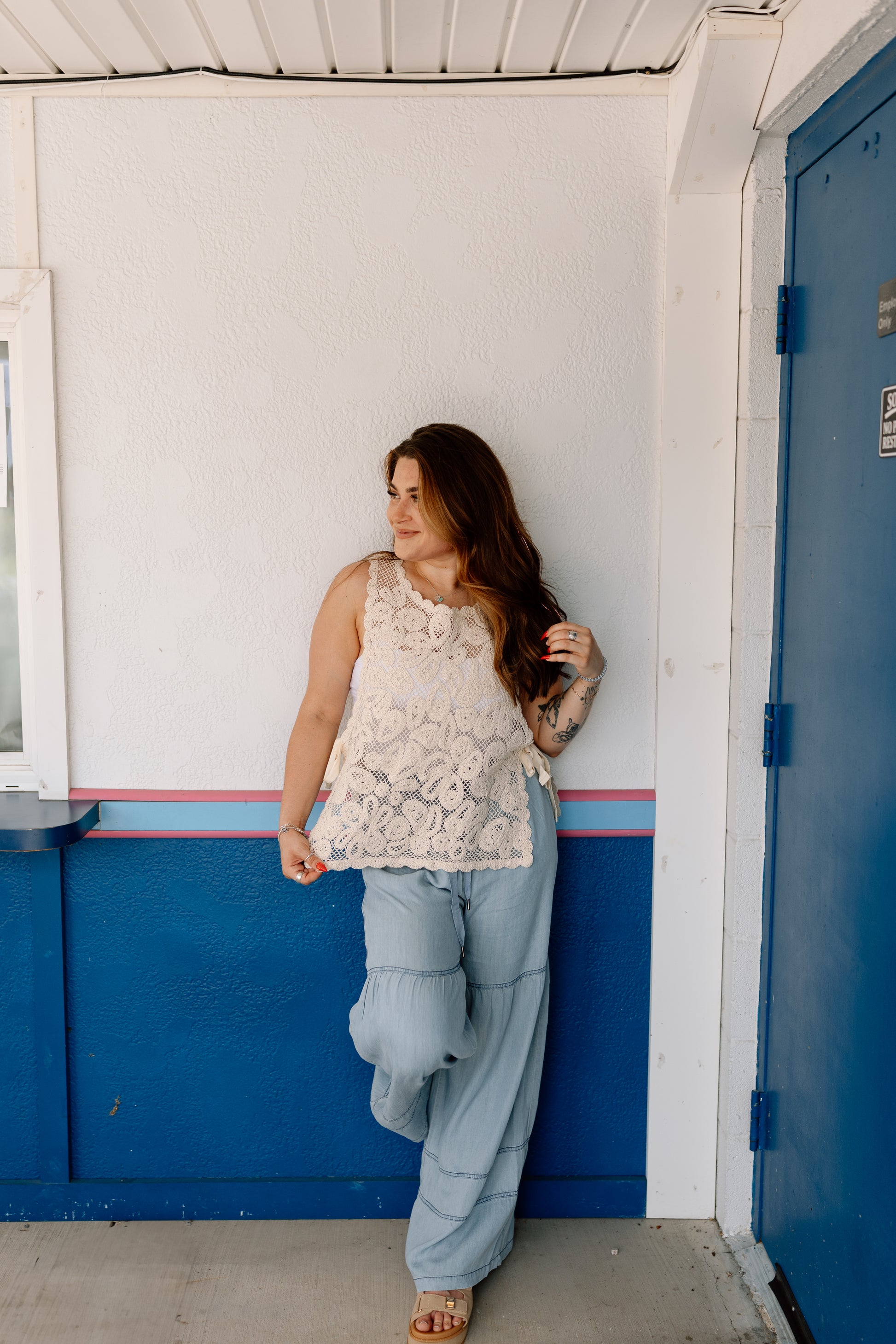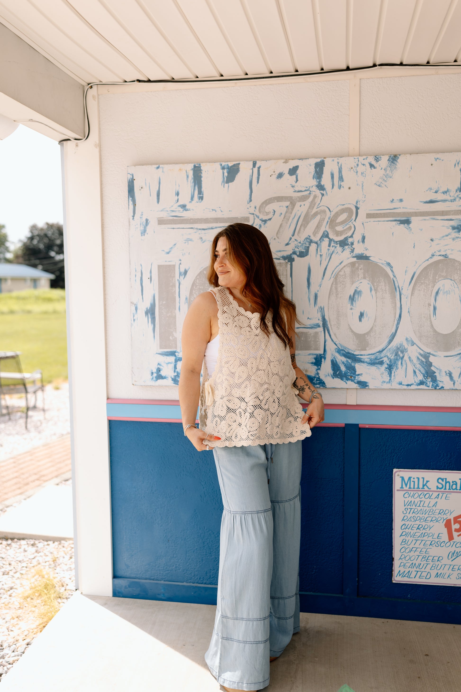 Washed denim tiered wide leg pants featuring drawstring elastic waistband and side pockets. True to size, stretchy chambray material. 28” inseam