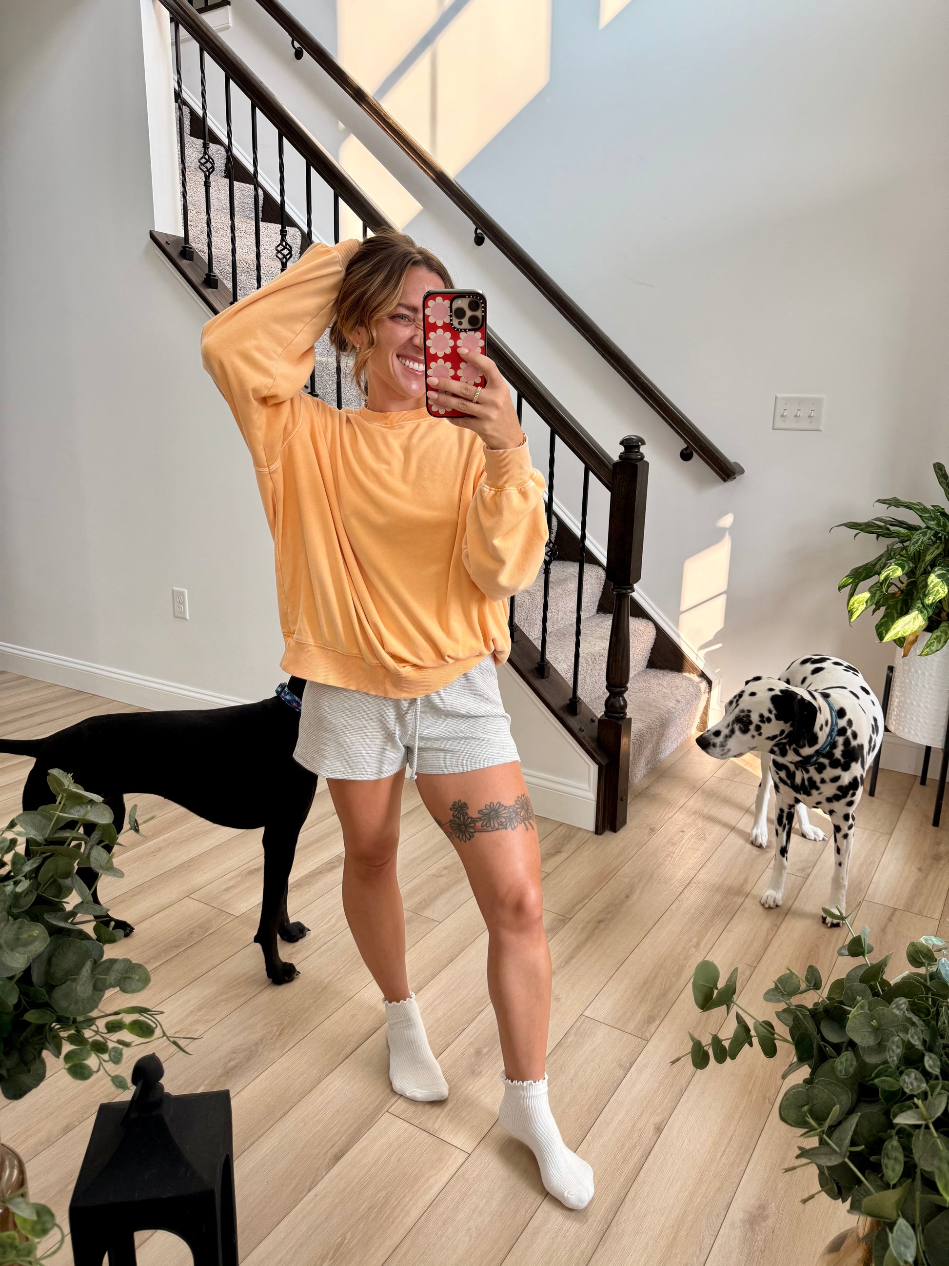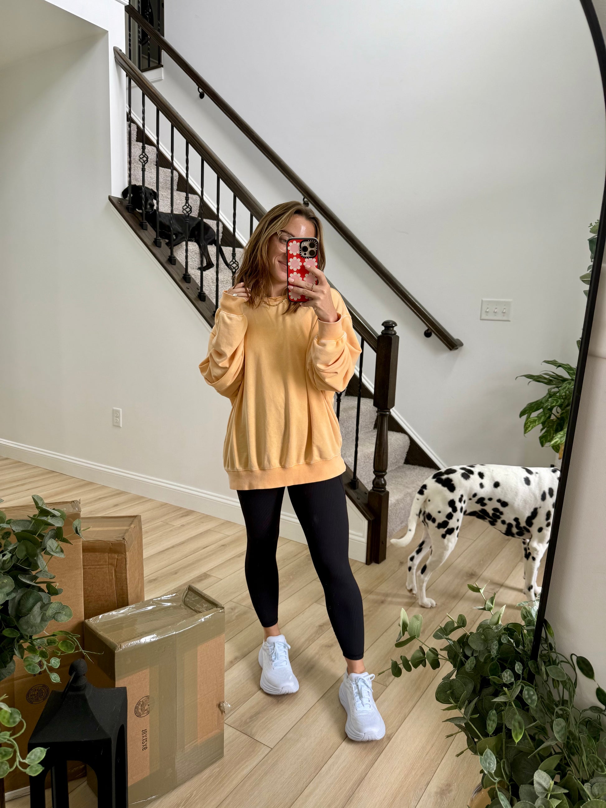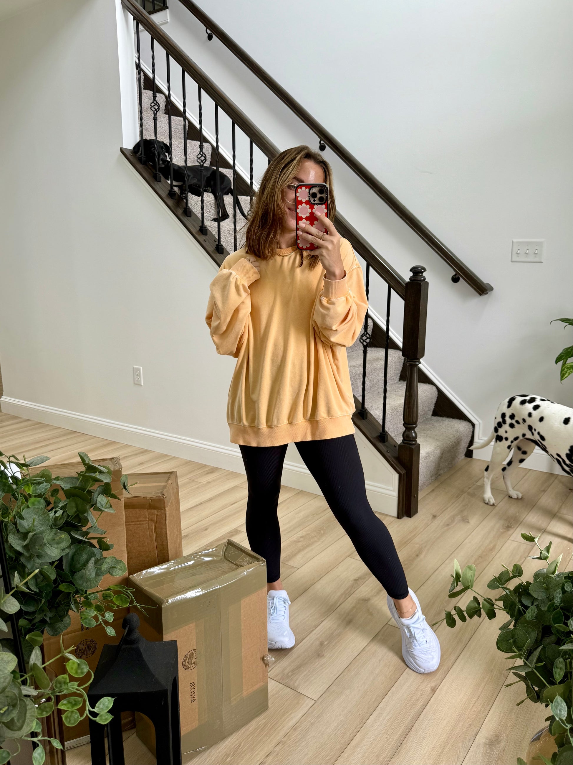 Relaxed fit && perfectly oversized. Catch me living in this pullover day after day. A muted peach tone. For a not-so-oversized fit, you can size down.