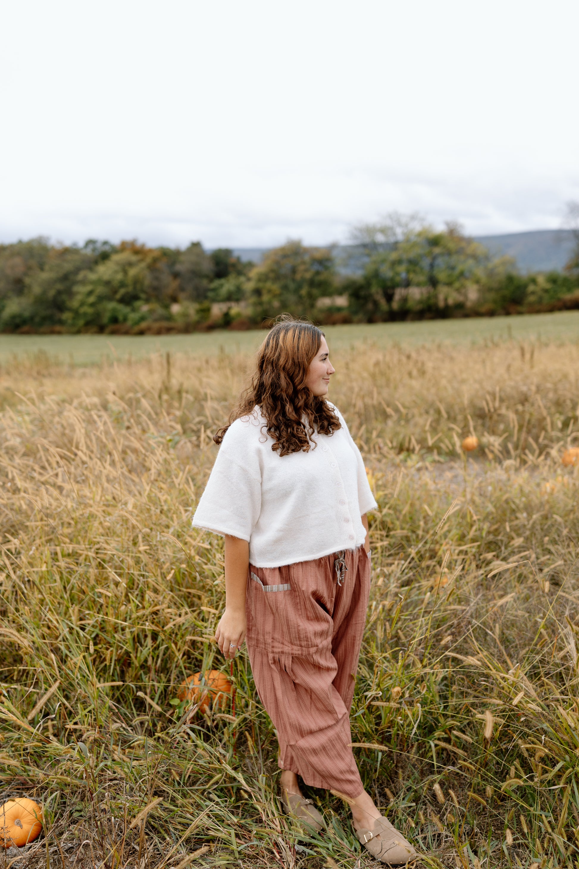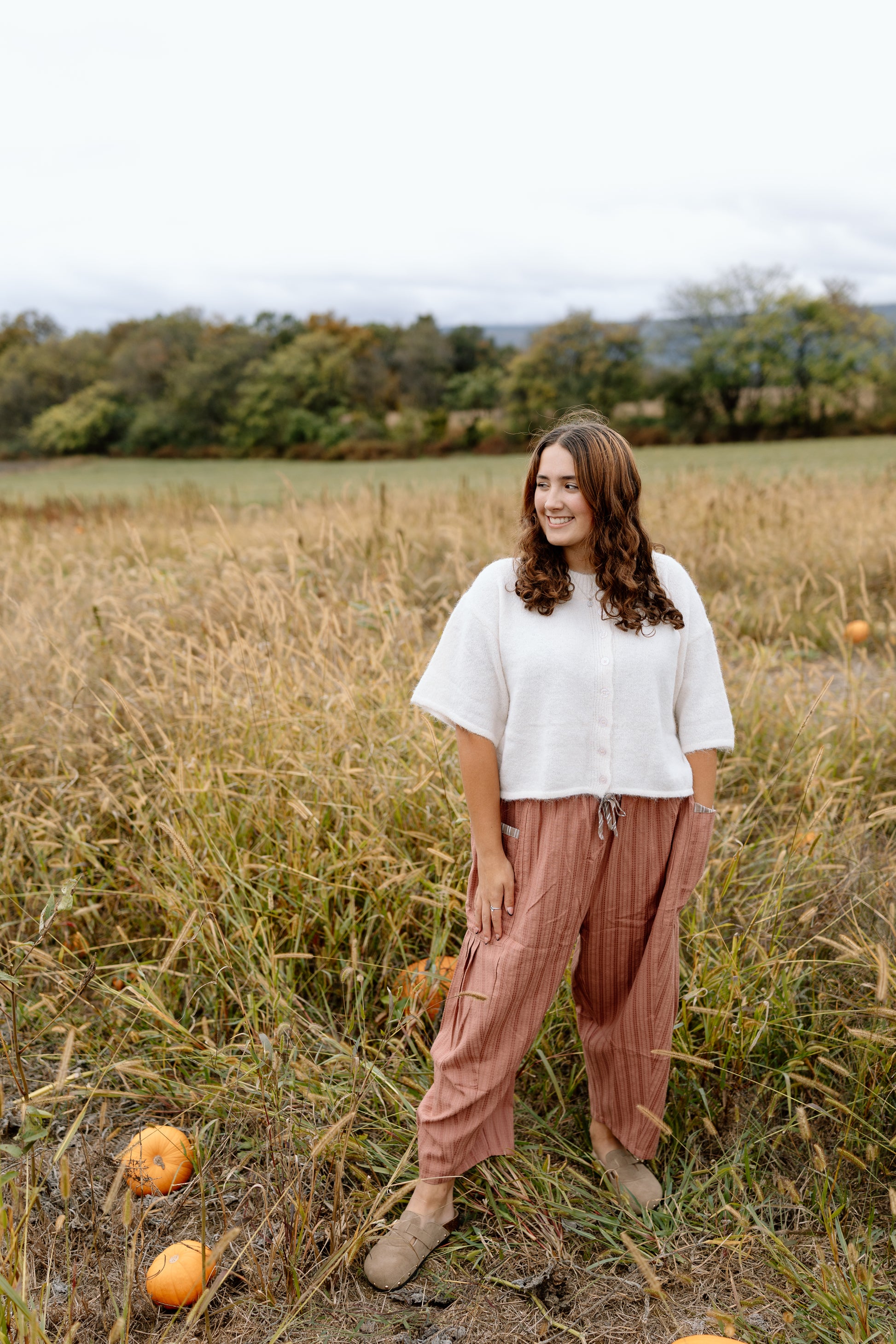 Textured boho pants with side tuck detail and oversized utility pockets. A beautiful mauve tone with stripe details. An effortless pant to style for the fall transition season, a denim jacket or sweater - yes please!