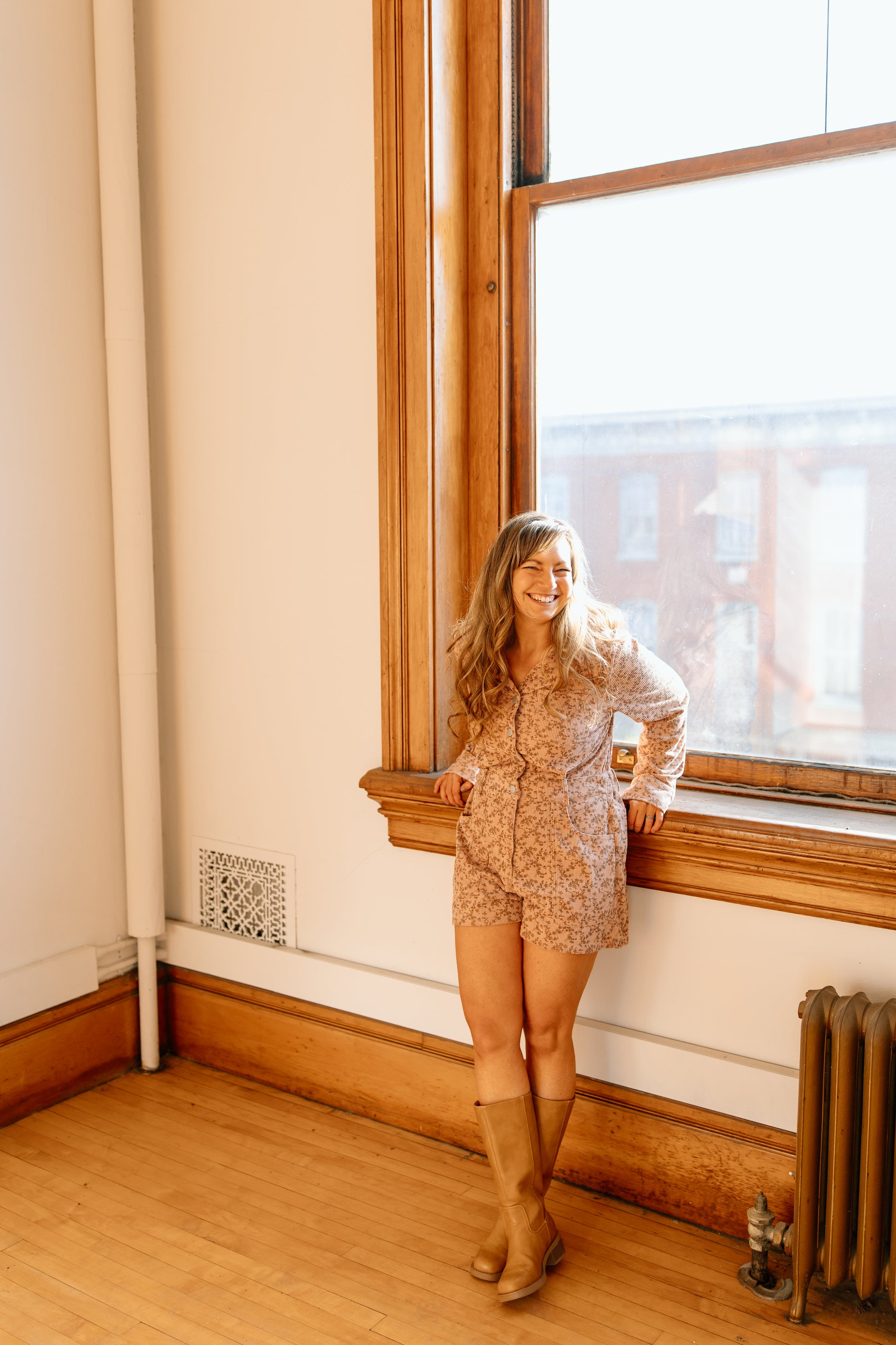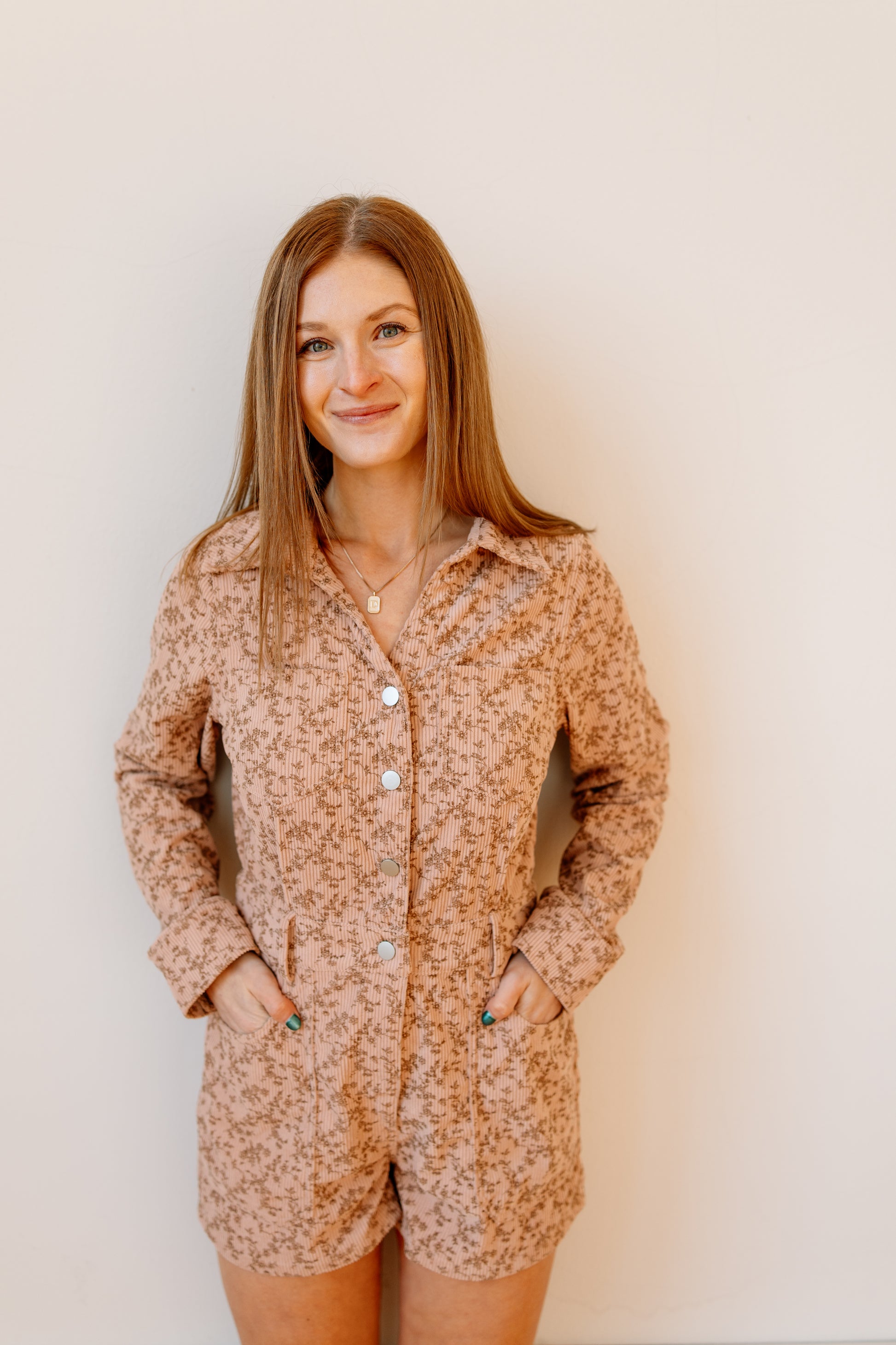 Floral print romper with front button closures and elastic waist. This high quality romper is one you'll pull for time and time again. 4.5" inseam.