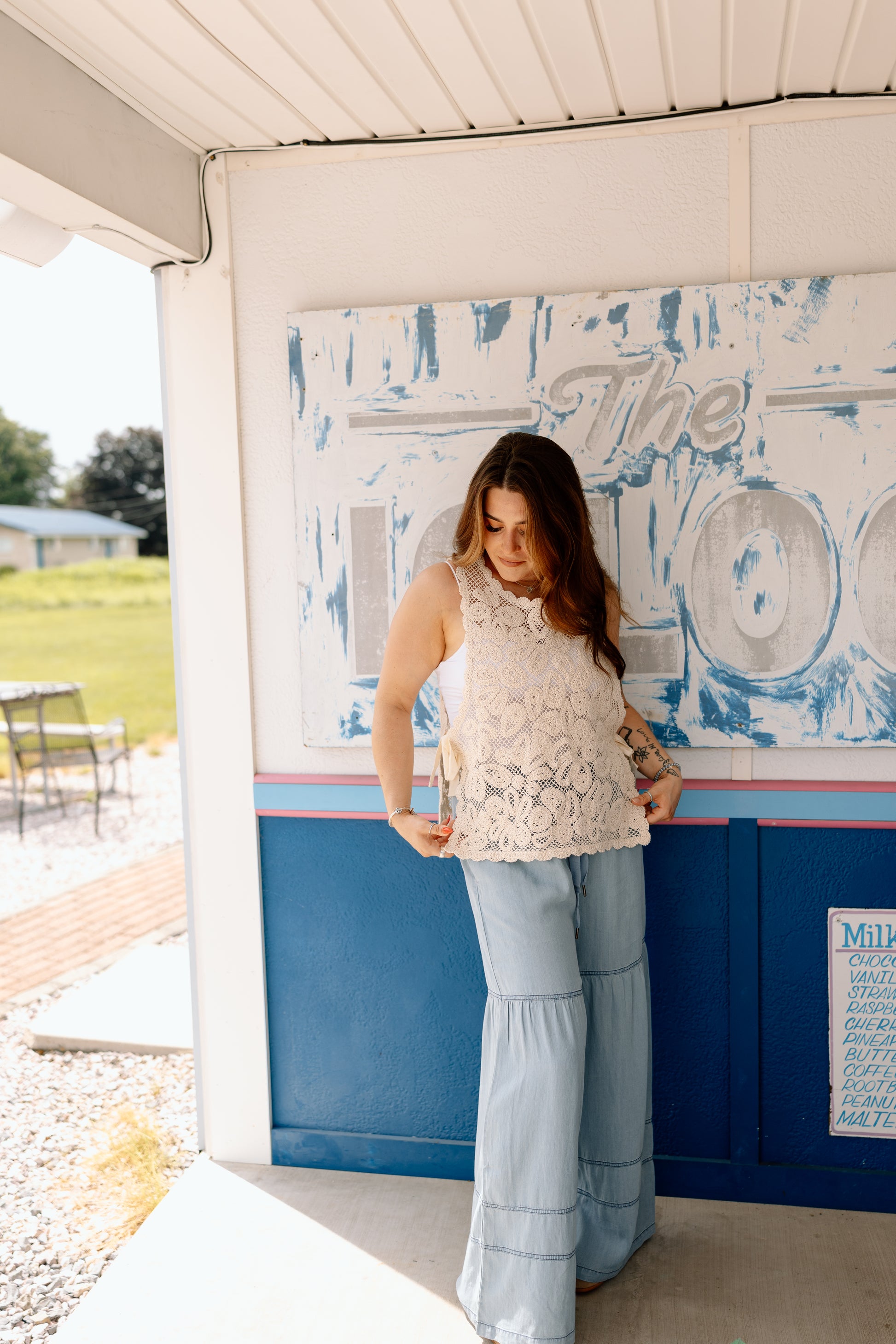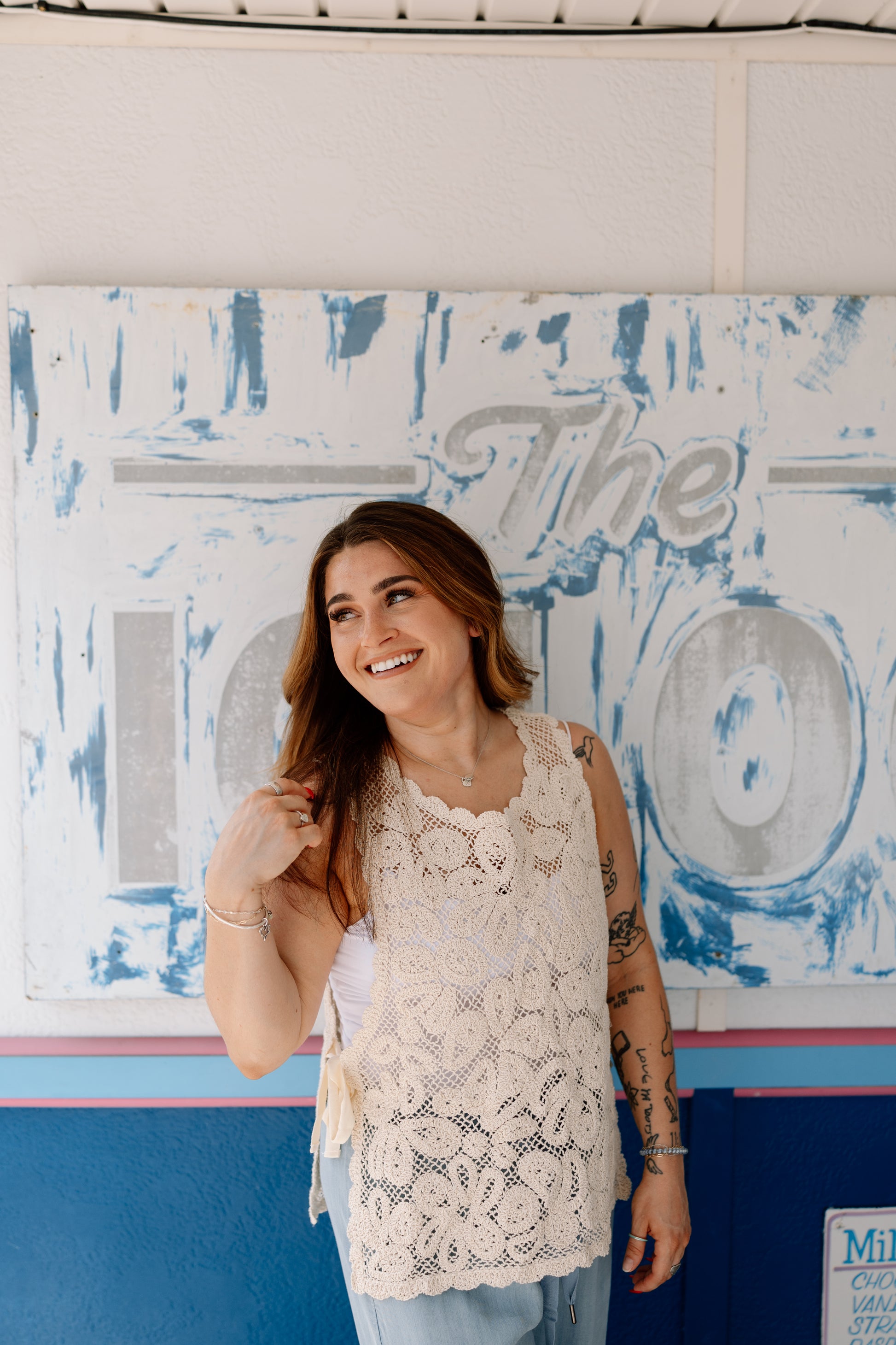 Crochet knit top with side details. Layer your fav tank under for an effortless, stylish look. Relaxed fit, adjustable with the side tie details! S/M is for small or medium top size. M/L would be large or XL top size.