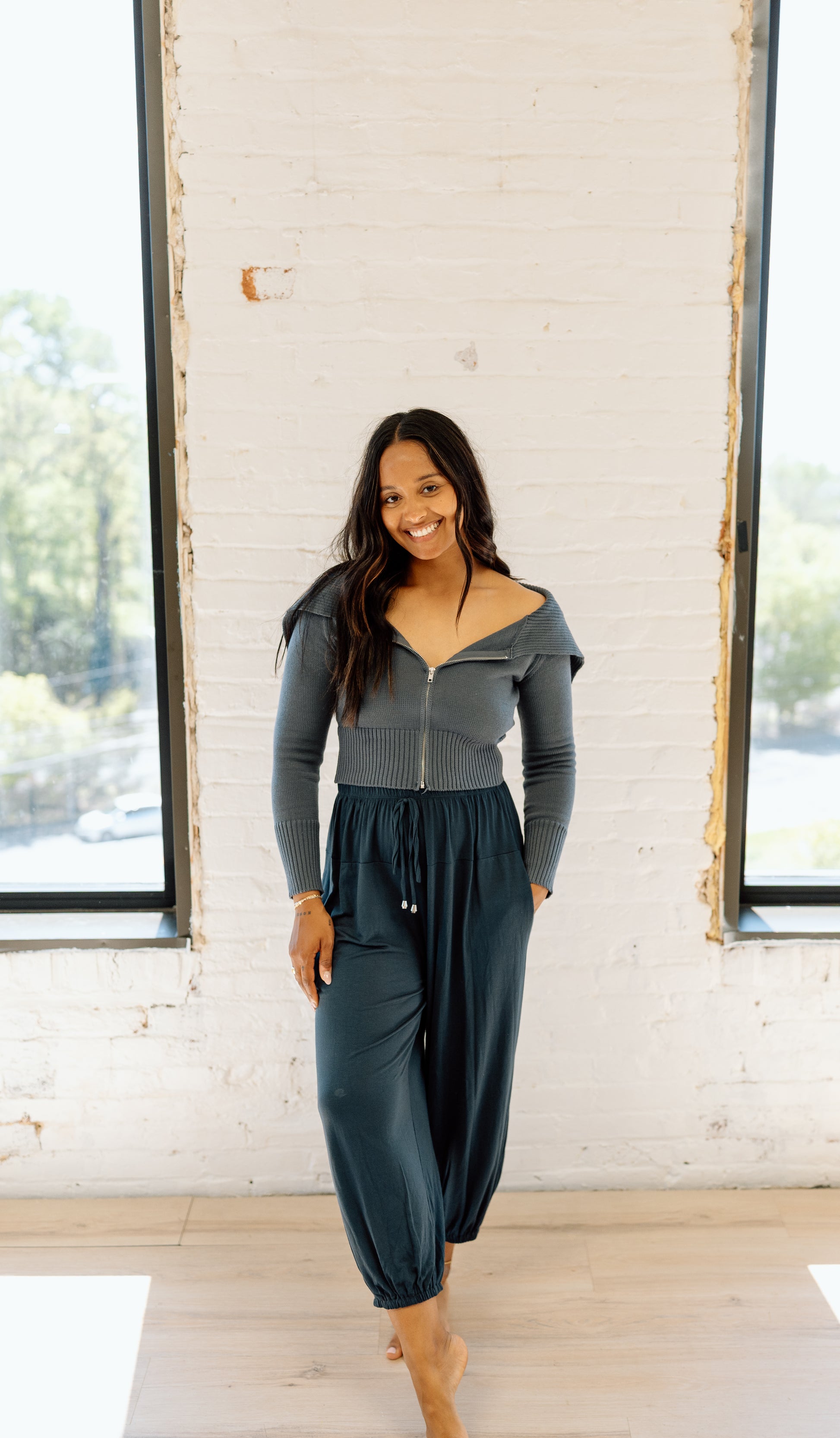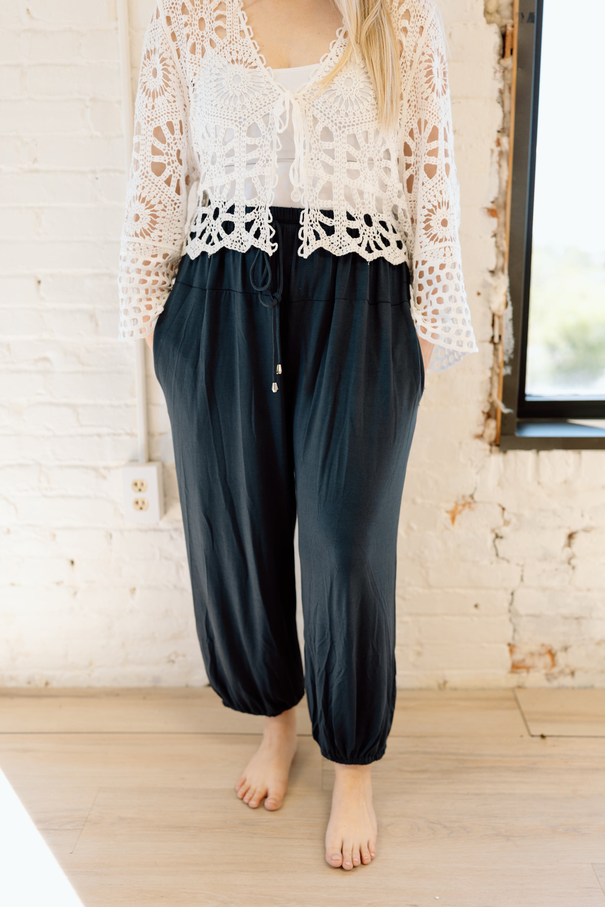 Relaxed fit jogger pant with stretchy waistband and faux tie detail. Need a pant you'll feel confident in day after day, this is her! Feel free to size down one size.