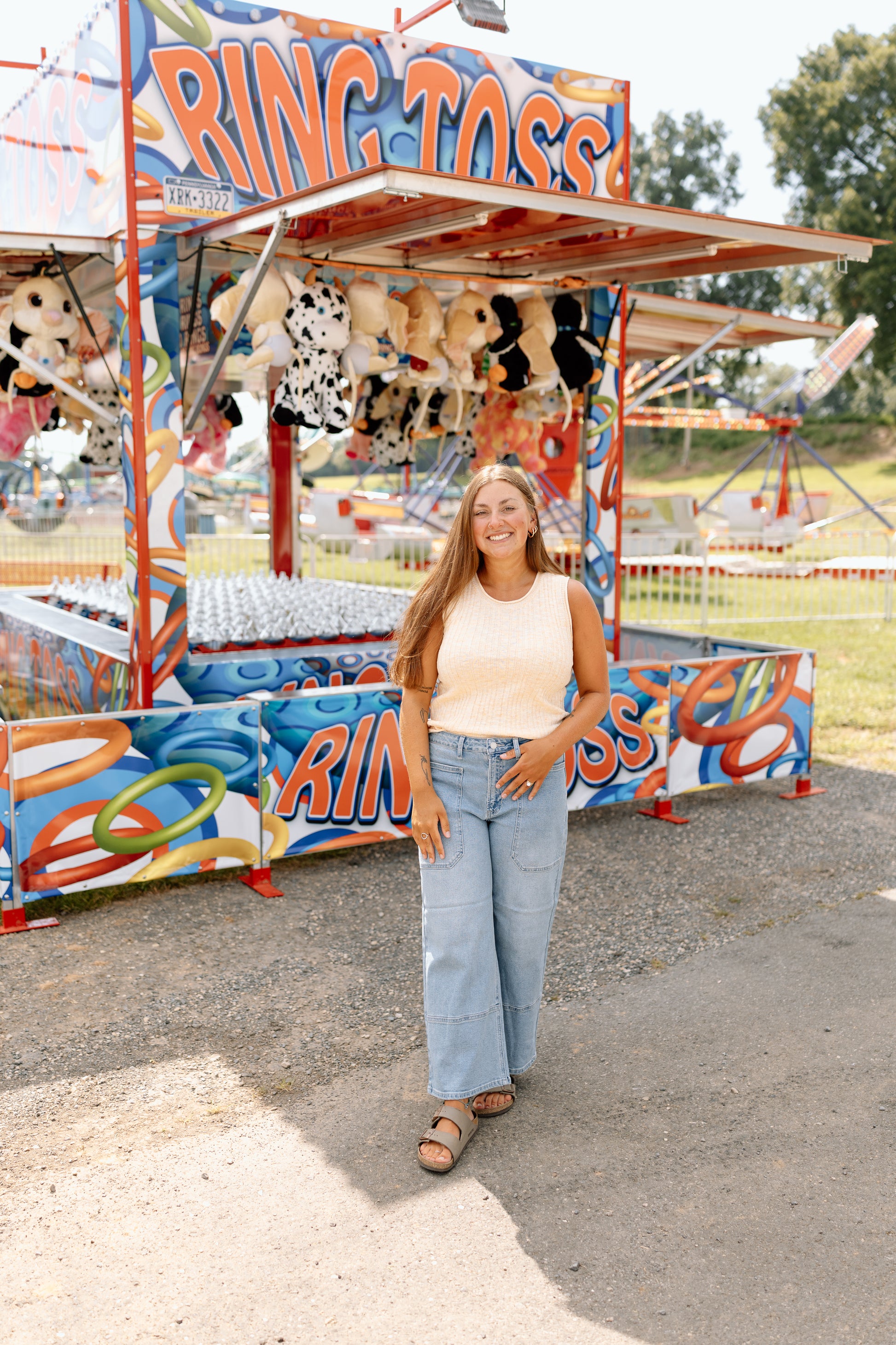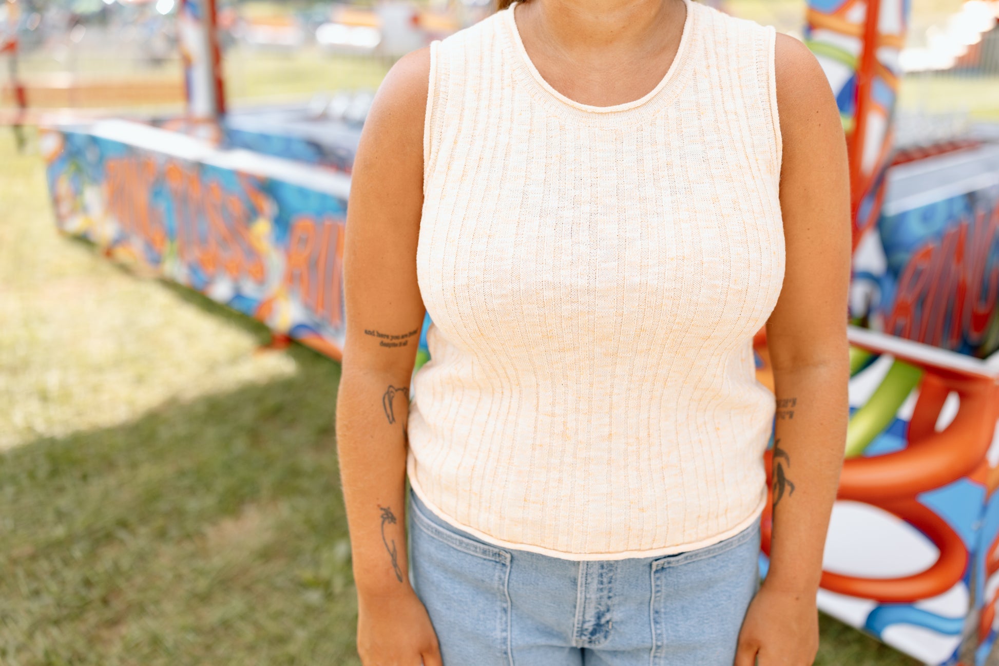 Ribbed knit, light weight sweater tank with rolled neckline. Relaxed fit.
