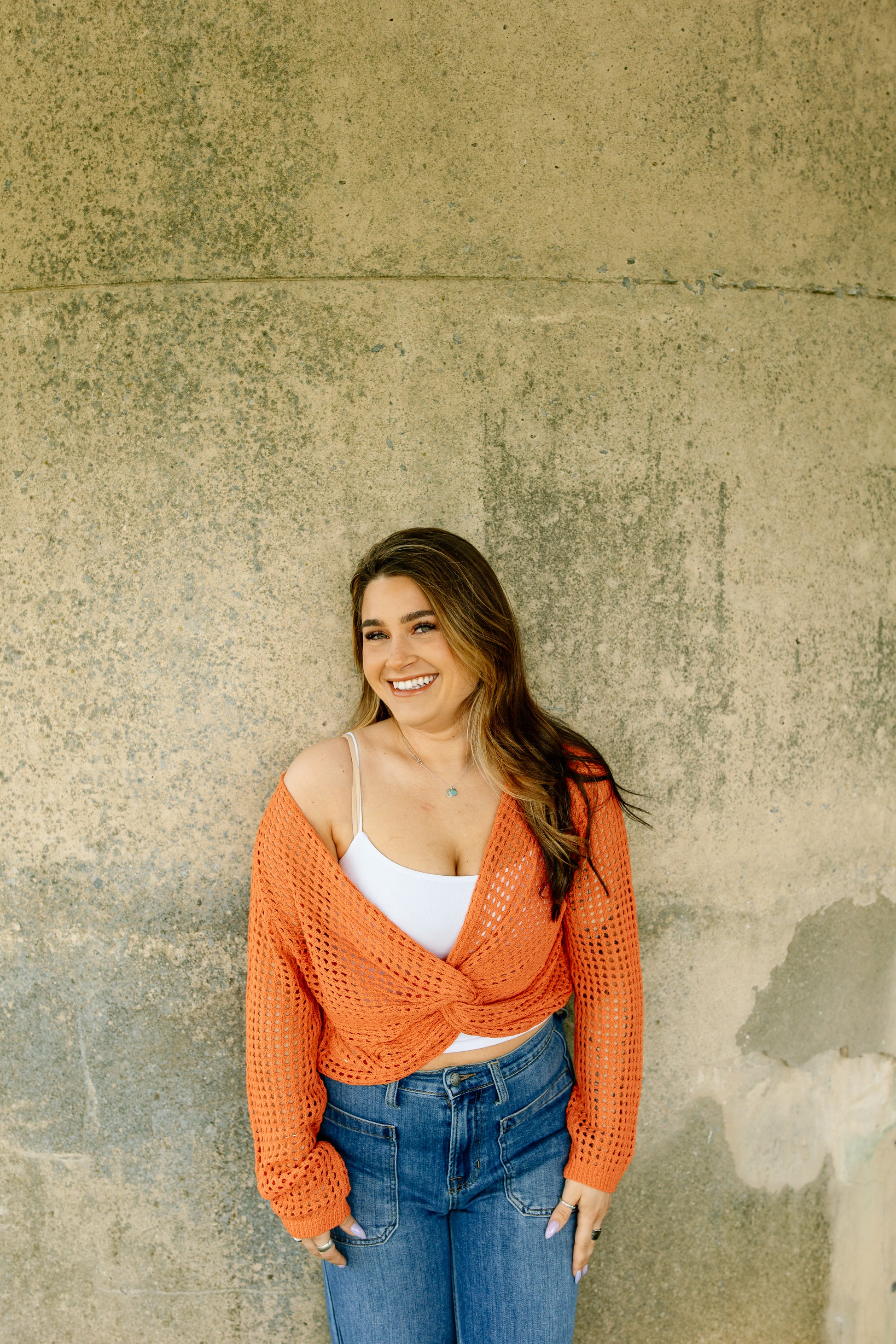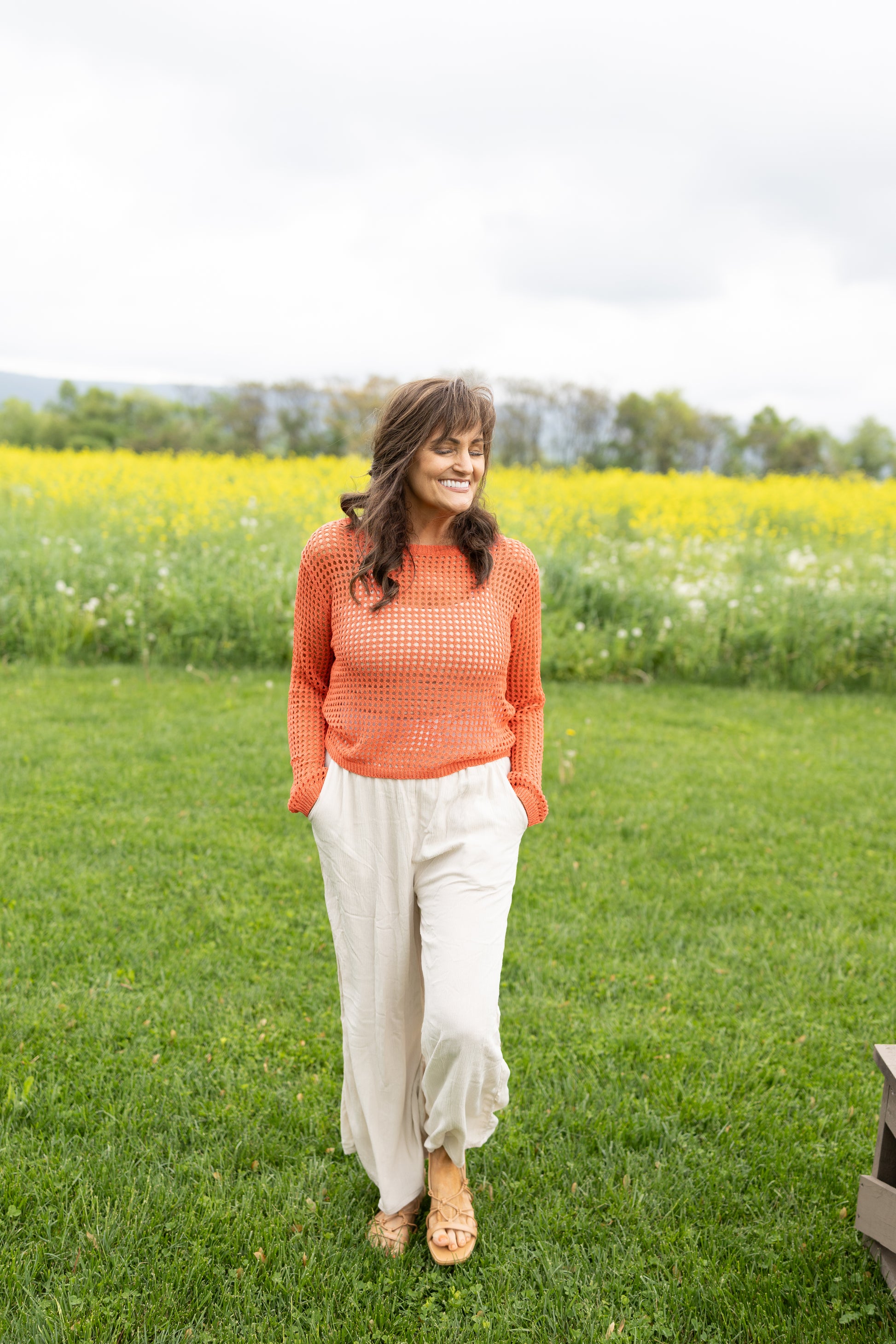 Two looks with one top, yes please! Our Rachel knit can be worn with the twist in front or back. Sheer: so wear with a nude top or over a bathing suit. Relaxed fit in your true to size.