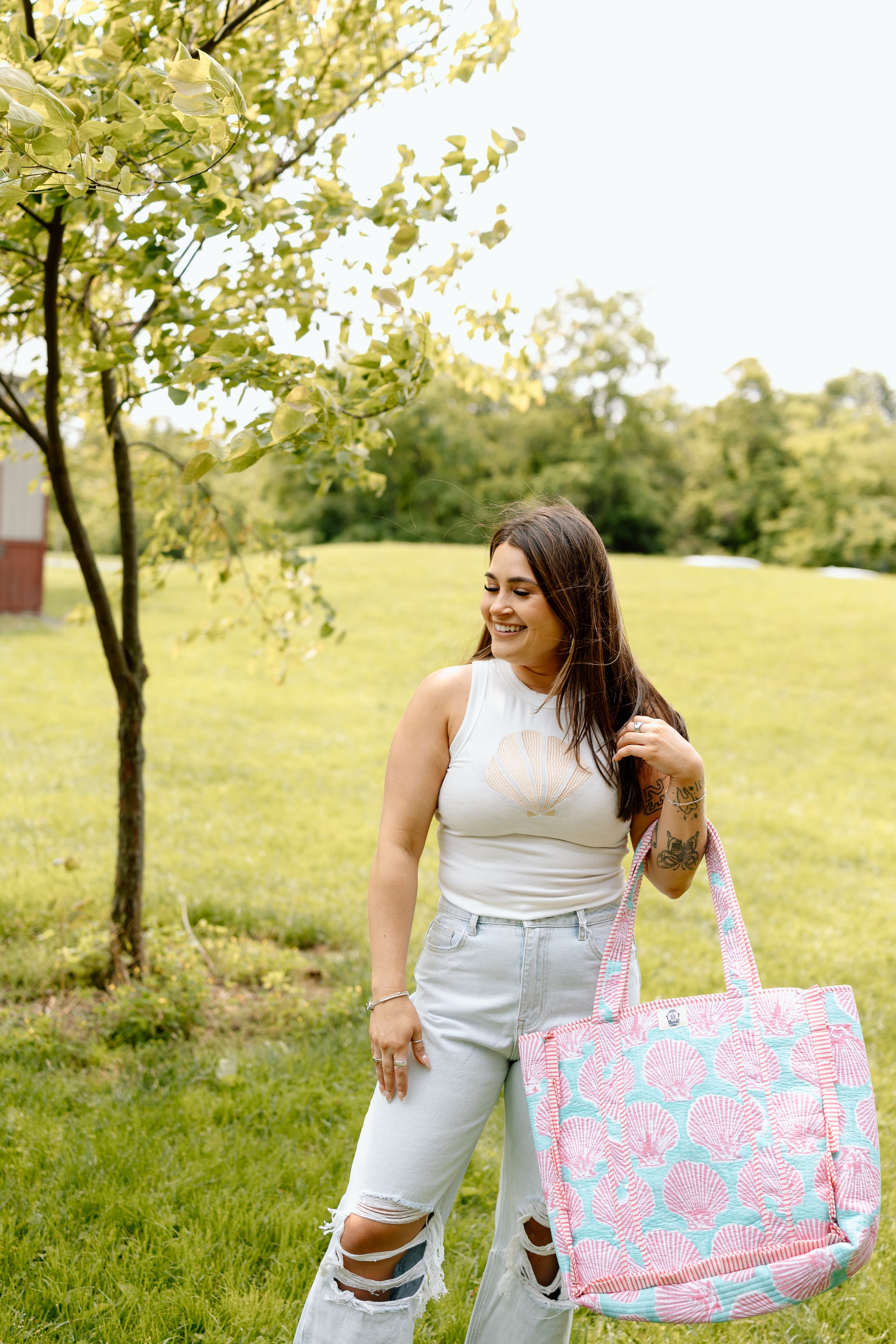 Quilted fabric. Bag measurements: 18” x 18”. Inside pocket for phones, etc.