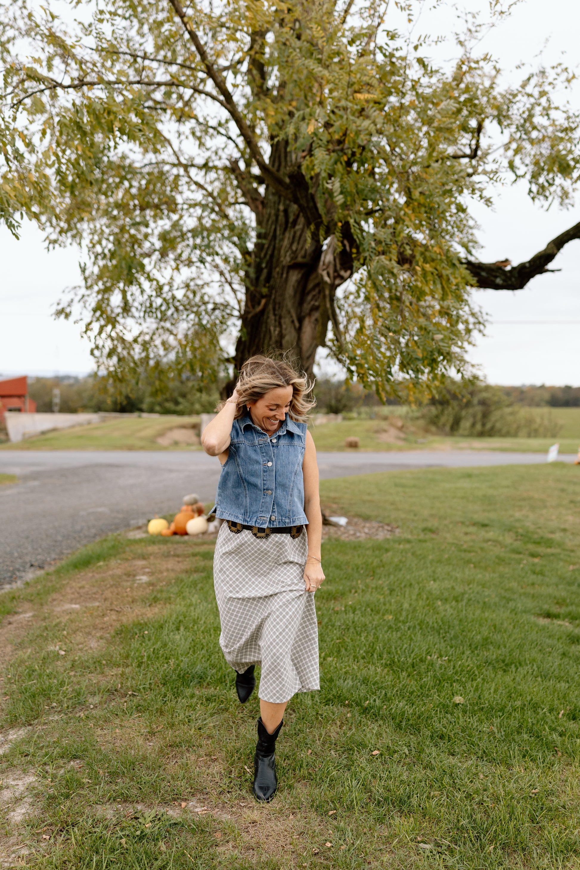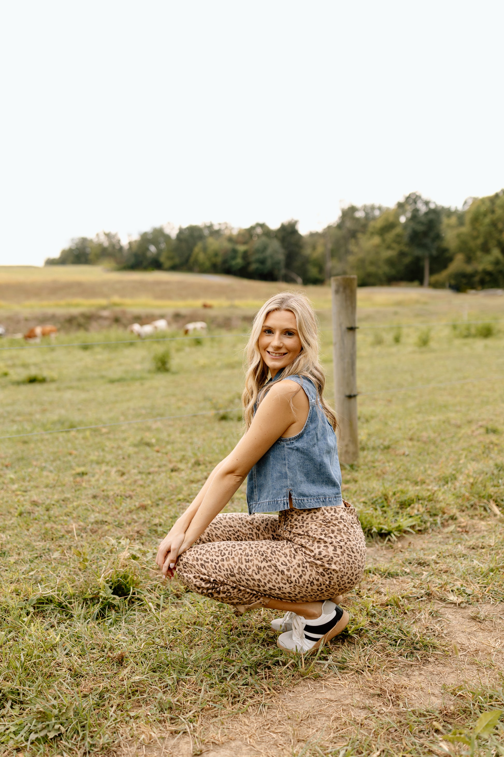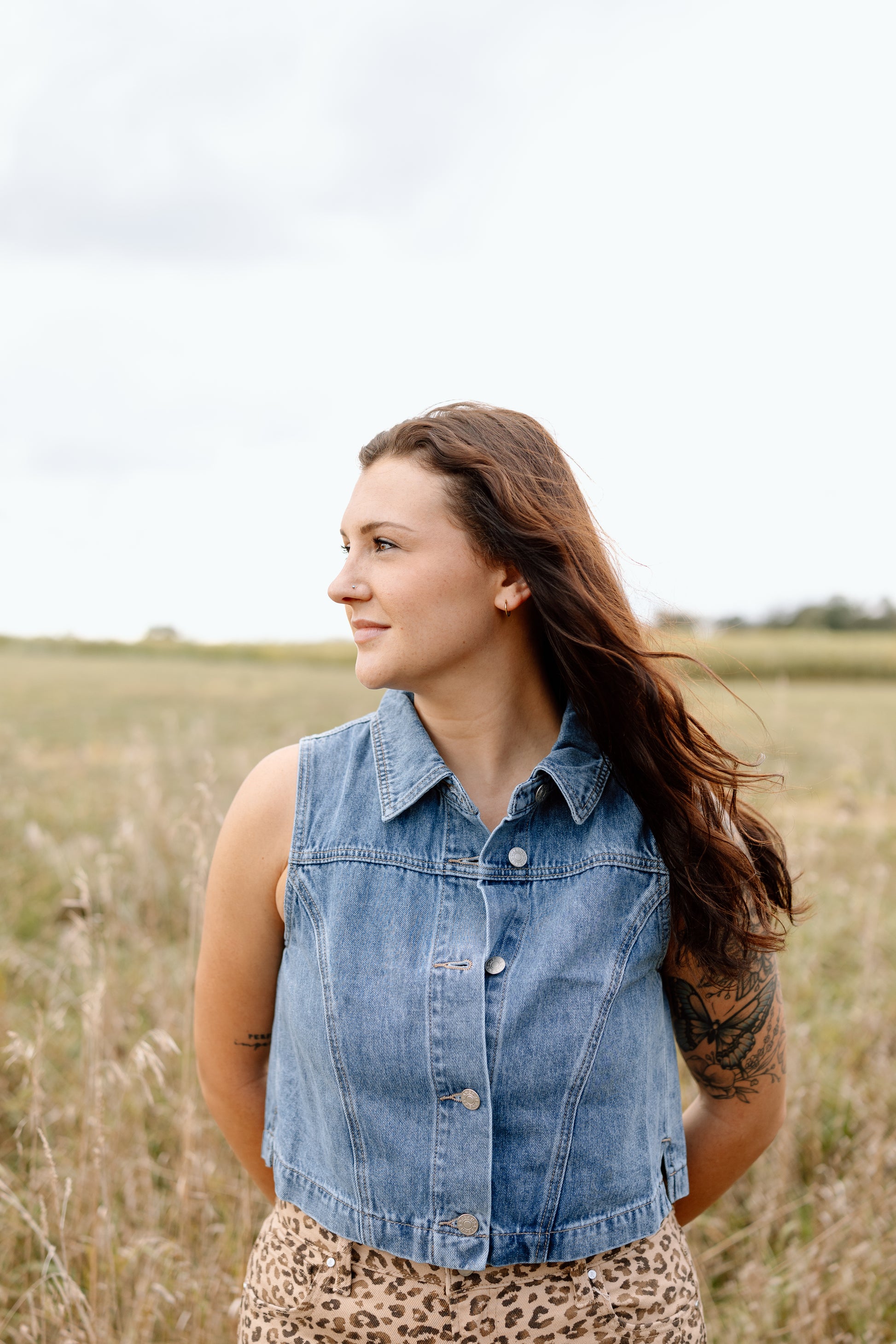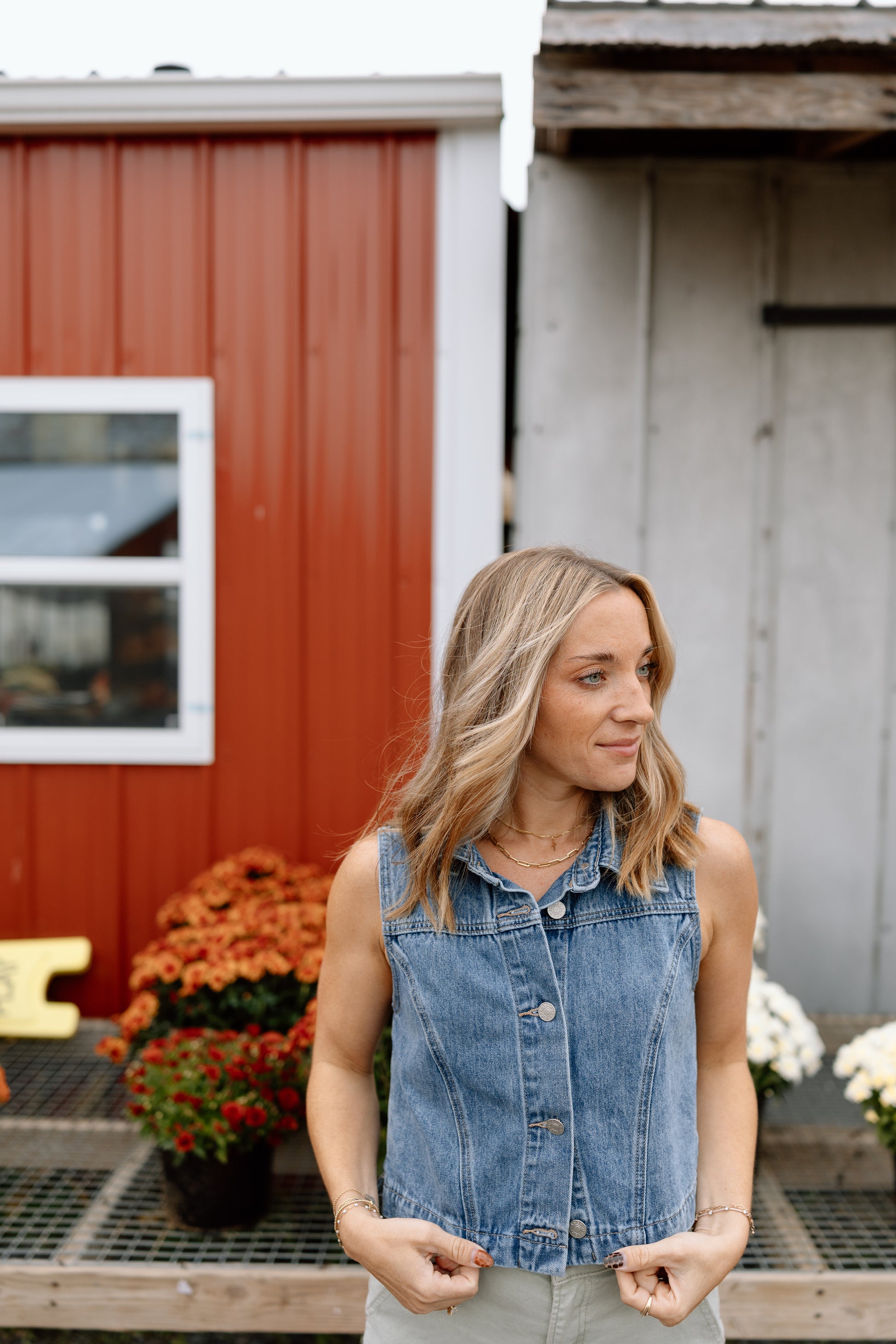 A denim vest to pair with any bottoms or over a dress. The perfect length. Stretchy denim material. If you're busty for your top size, size up one!