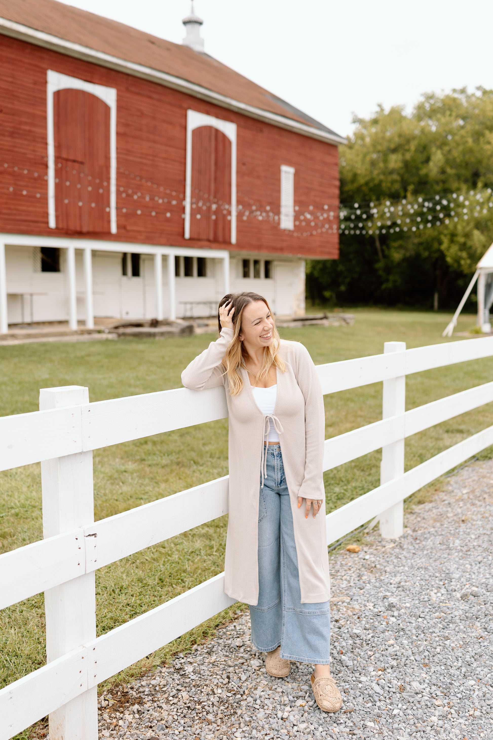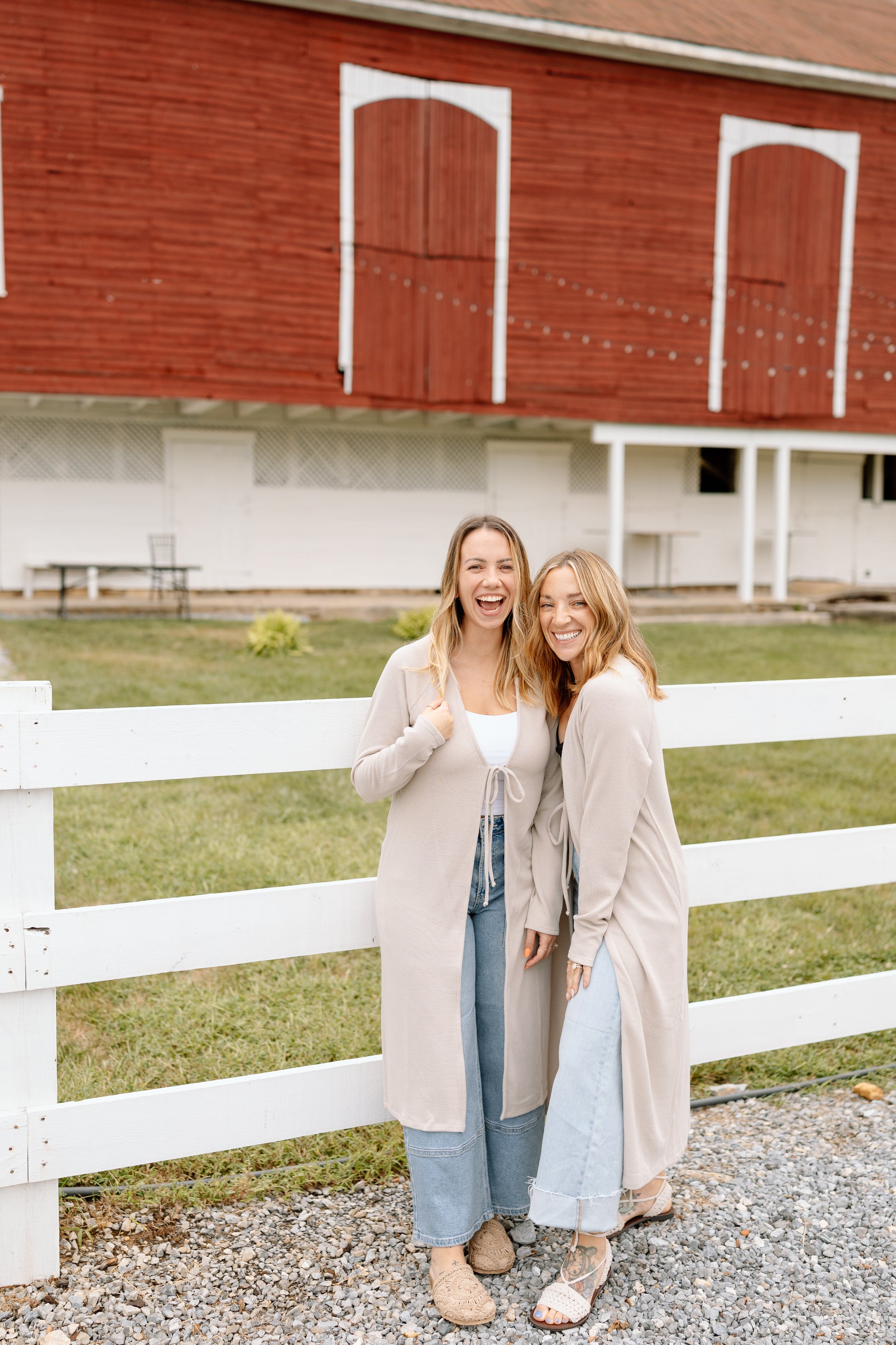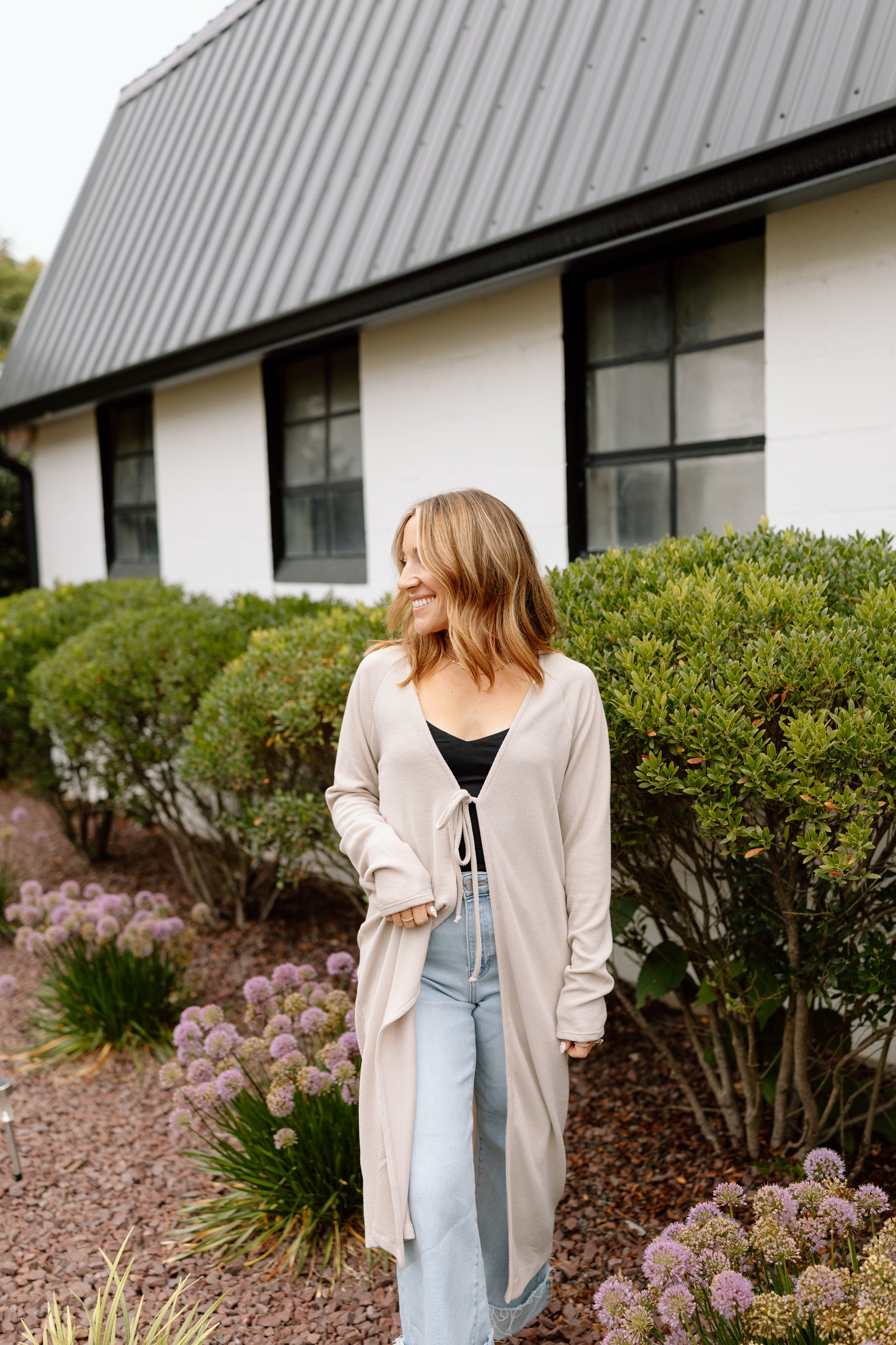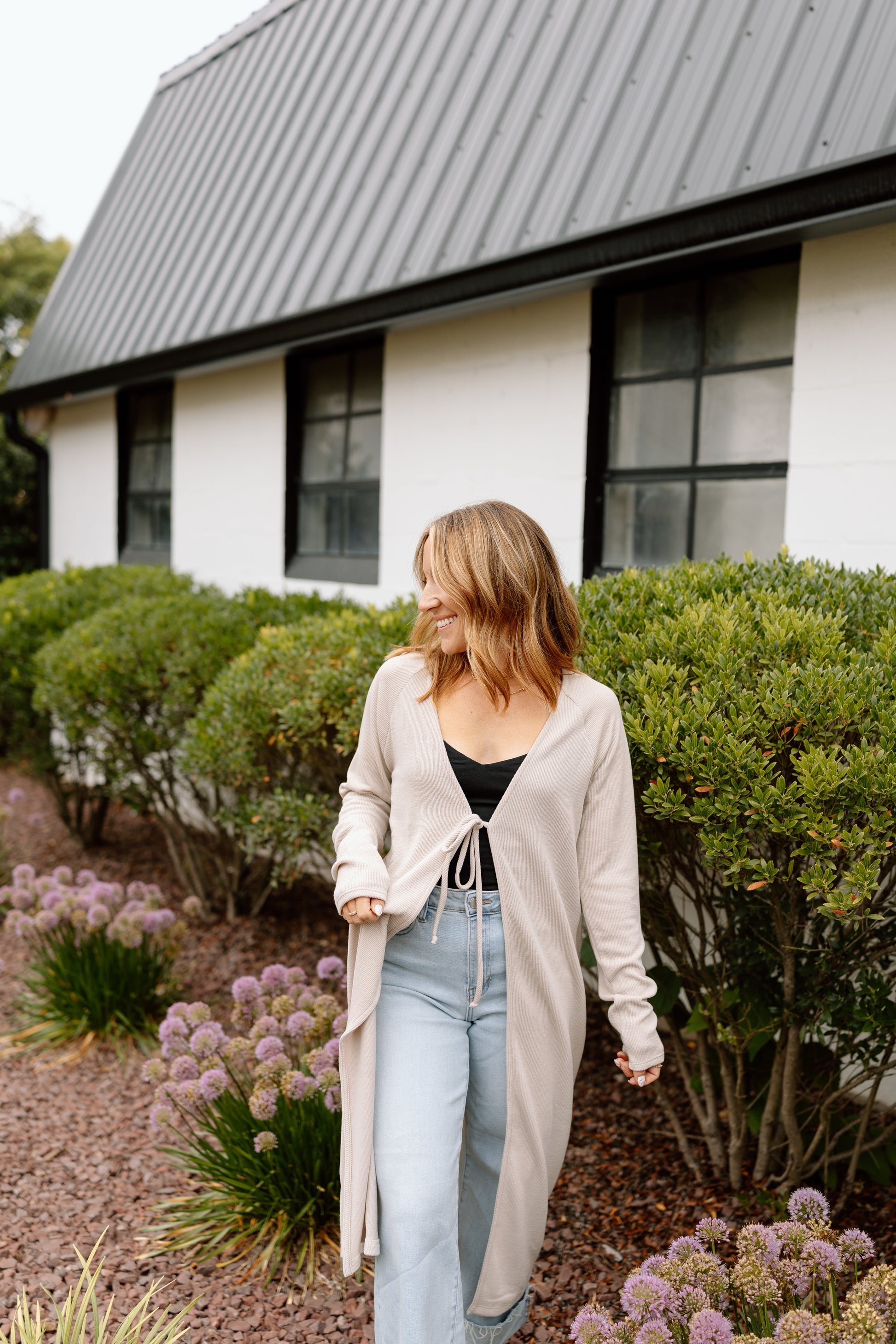 Full length cardigan with tie detail. Made from a blend of 86% Polyester, 12% Rayon, and 2% Spandex, it's soft as a baby kitten. True to size, relaxed fit.