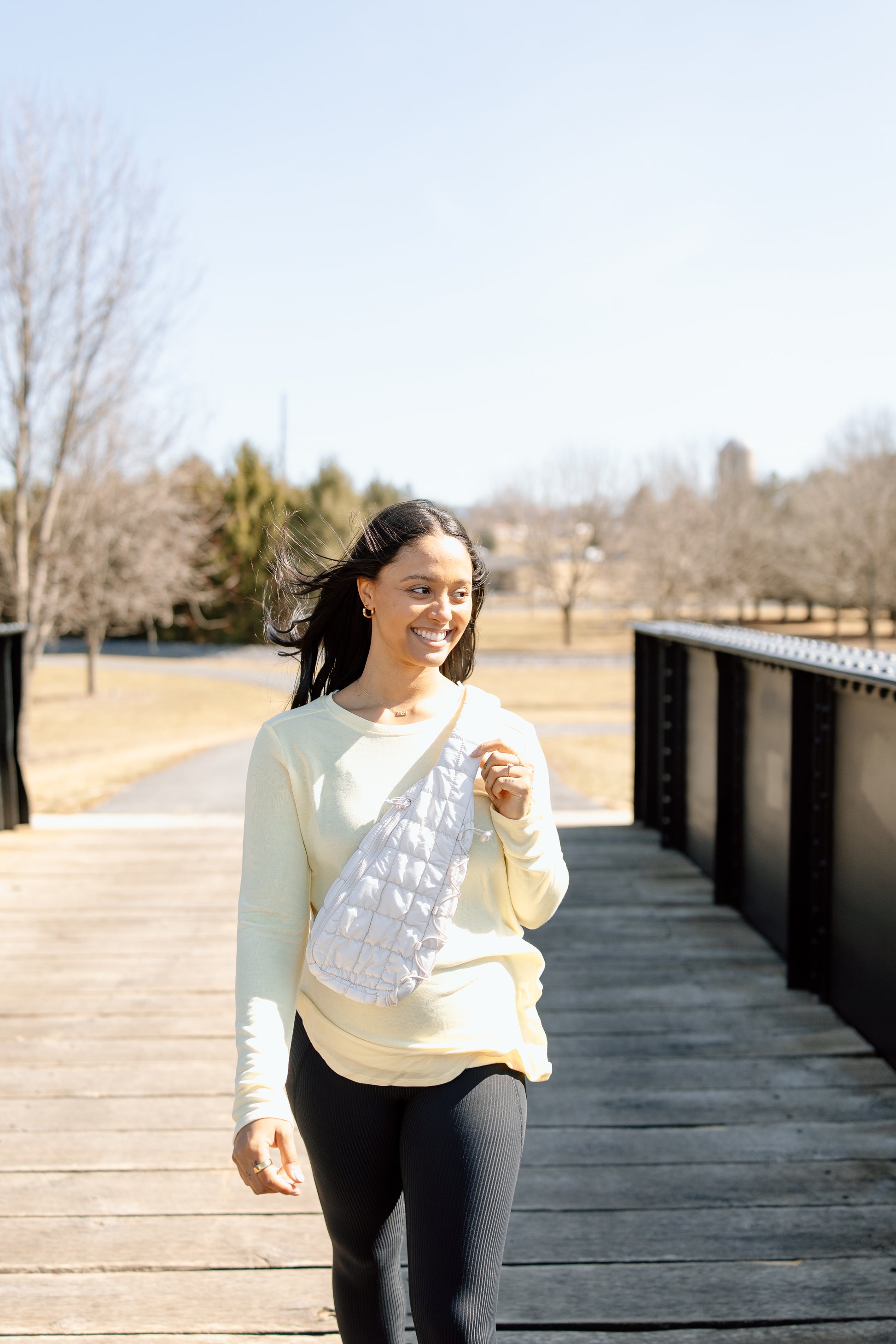 Solid Quilted Sling Bag 100% Polyester. Zipper closure, adjustable strap.