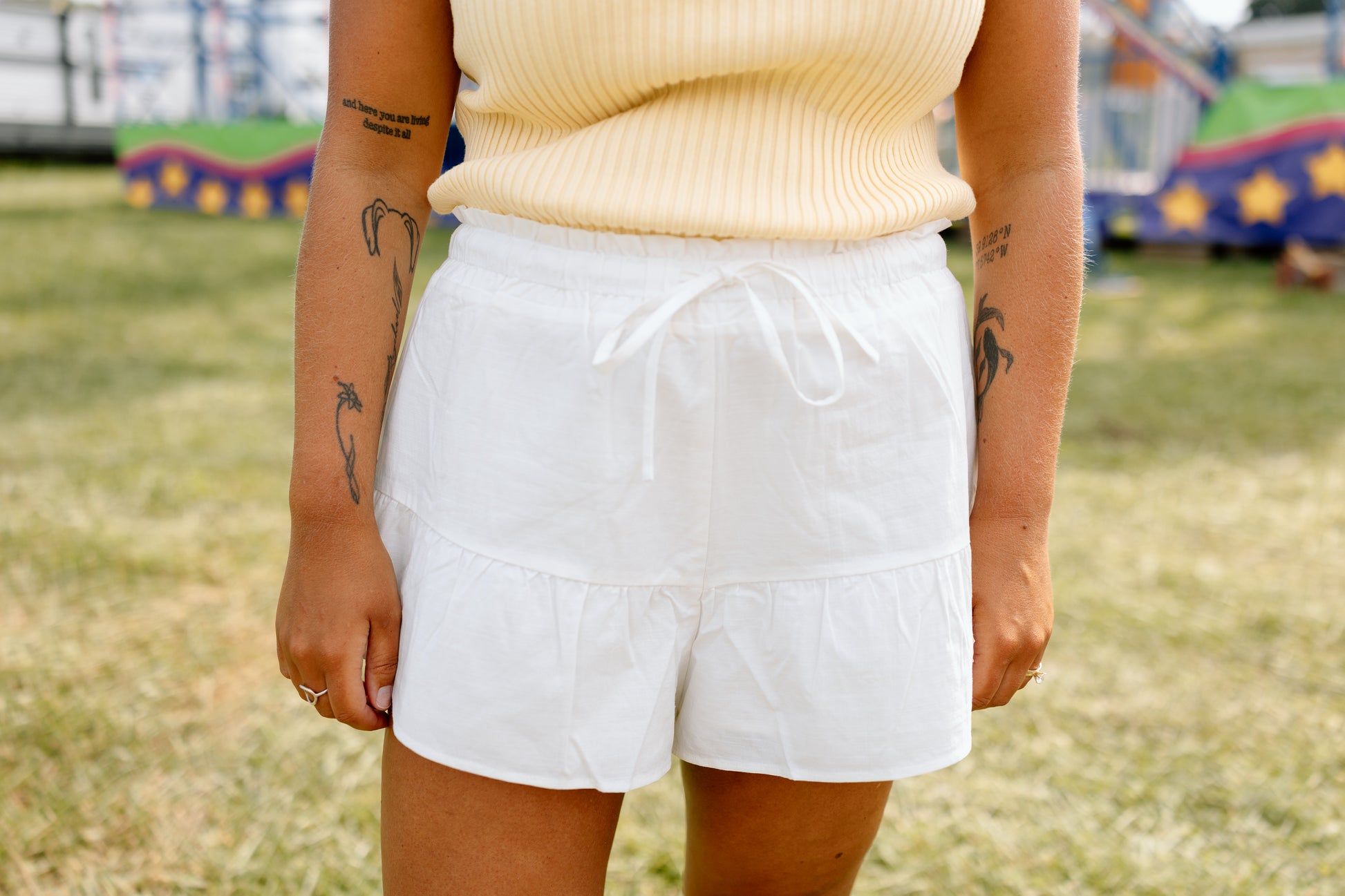Get ready for the weekend in these gently flared shorts. The best feminine silhouette. Elastic band waist. 3" inseam. In between sizes? Go to your smaller.