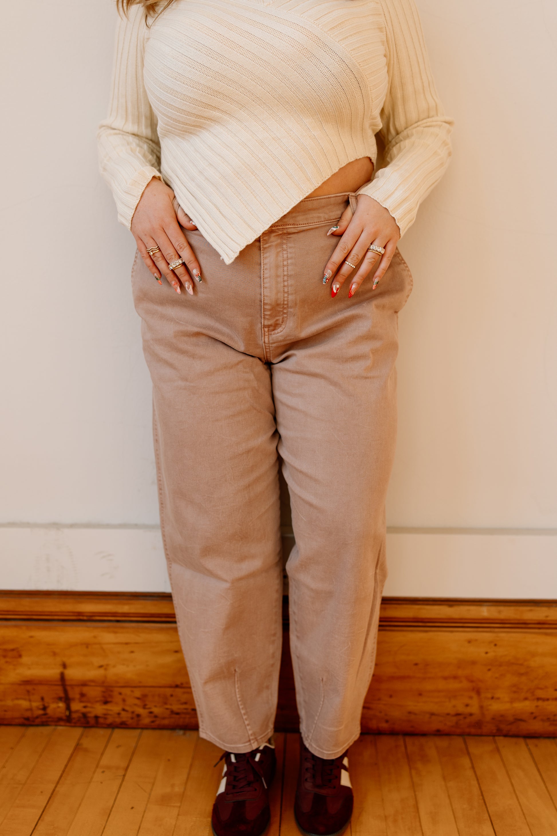 To say we are obsessed with this muted mauve pant would be a sheer understatement. High rise, comfort stretch. 28" inseam. Can size down one if you want them to be more fitted!