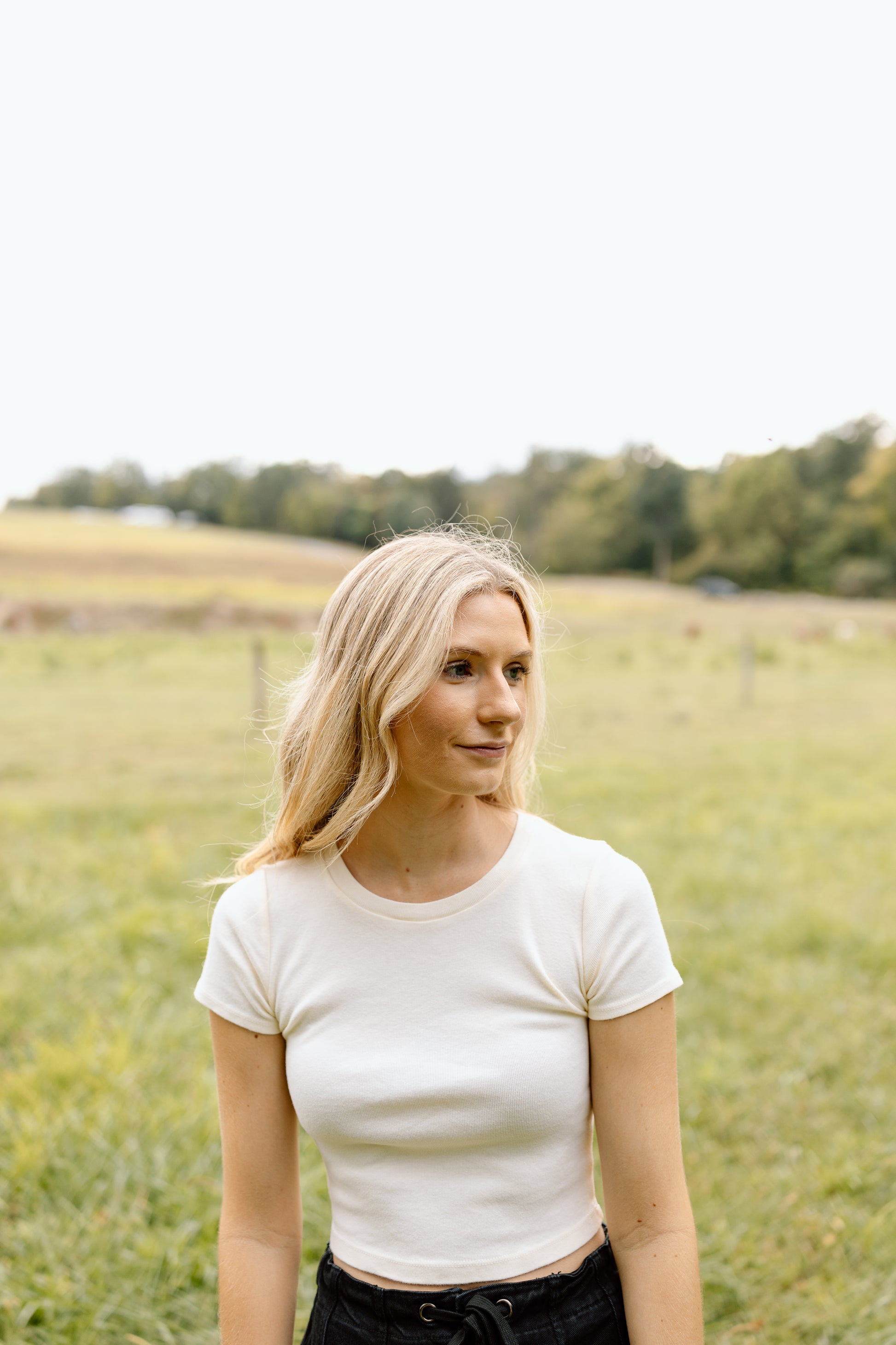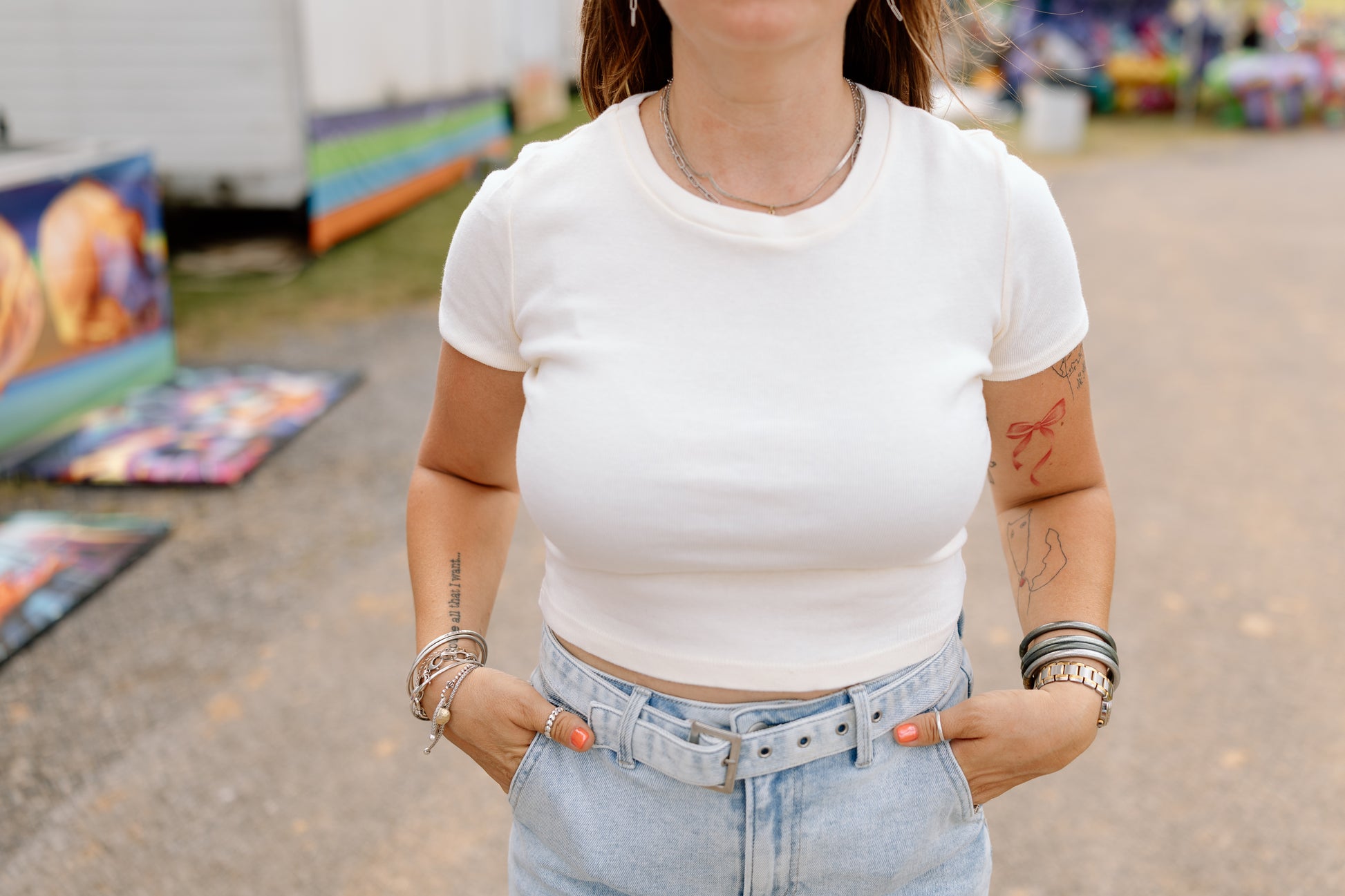 Relaxed fit, mid length baby tee. OBSESSING over the color and 'fit of this one. Grab your true top size - bustier? Size up one for more comfort.