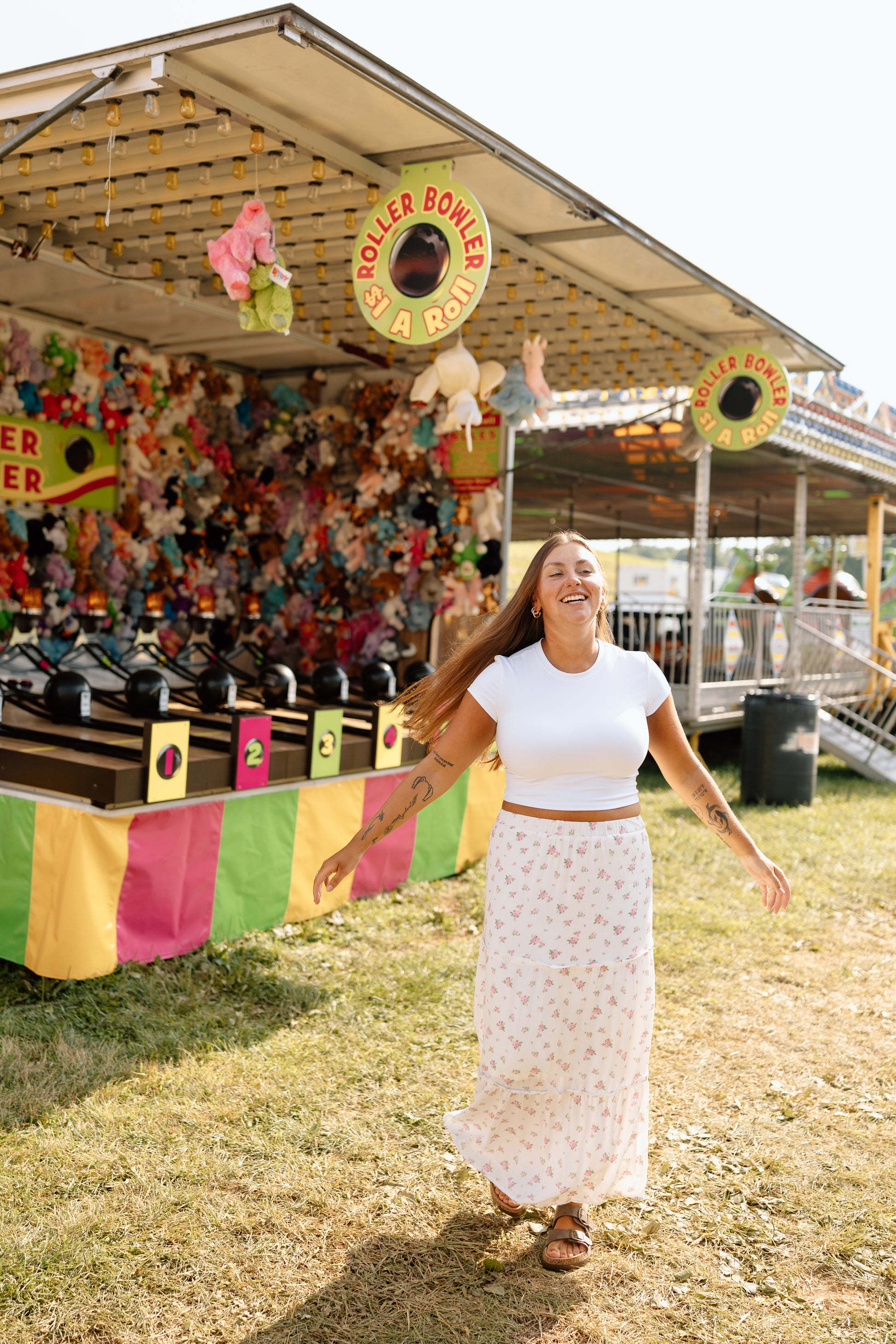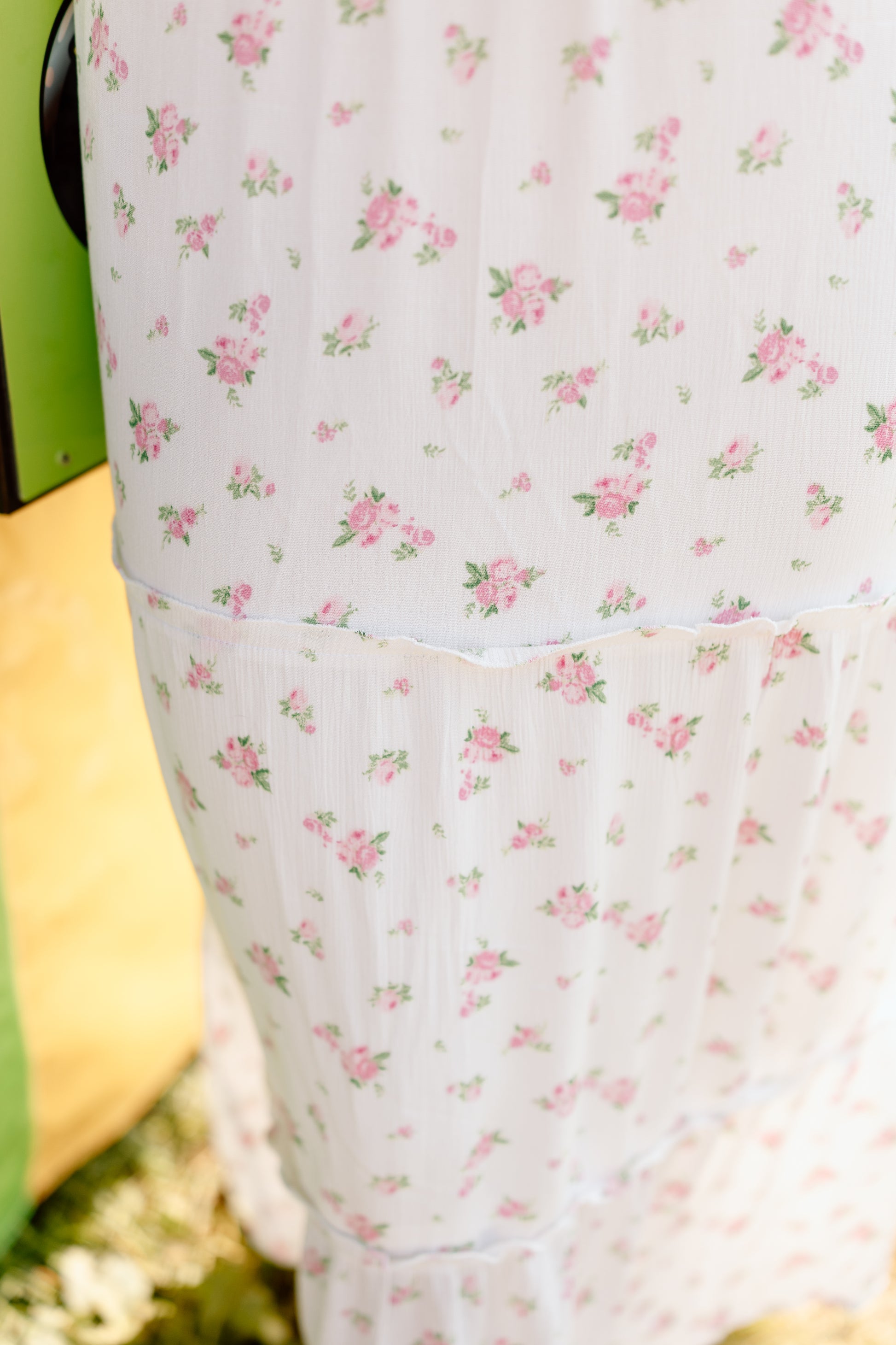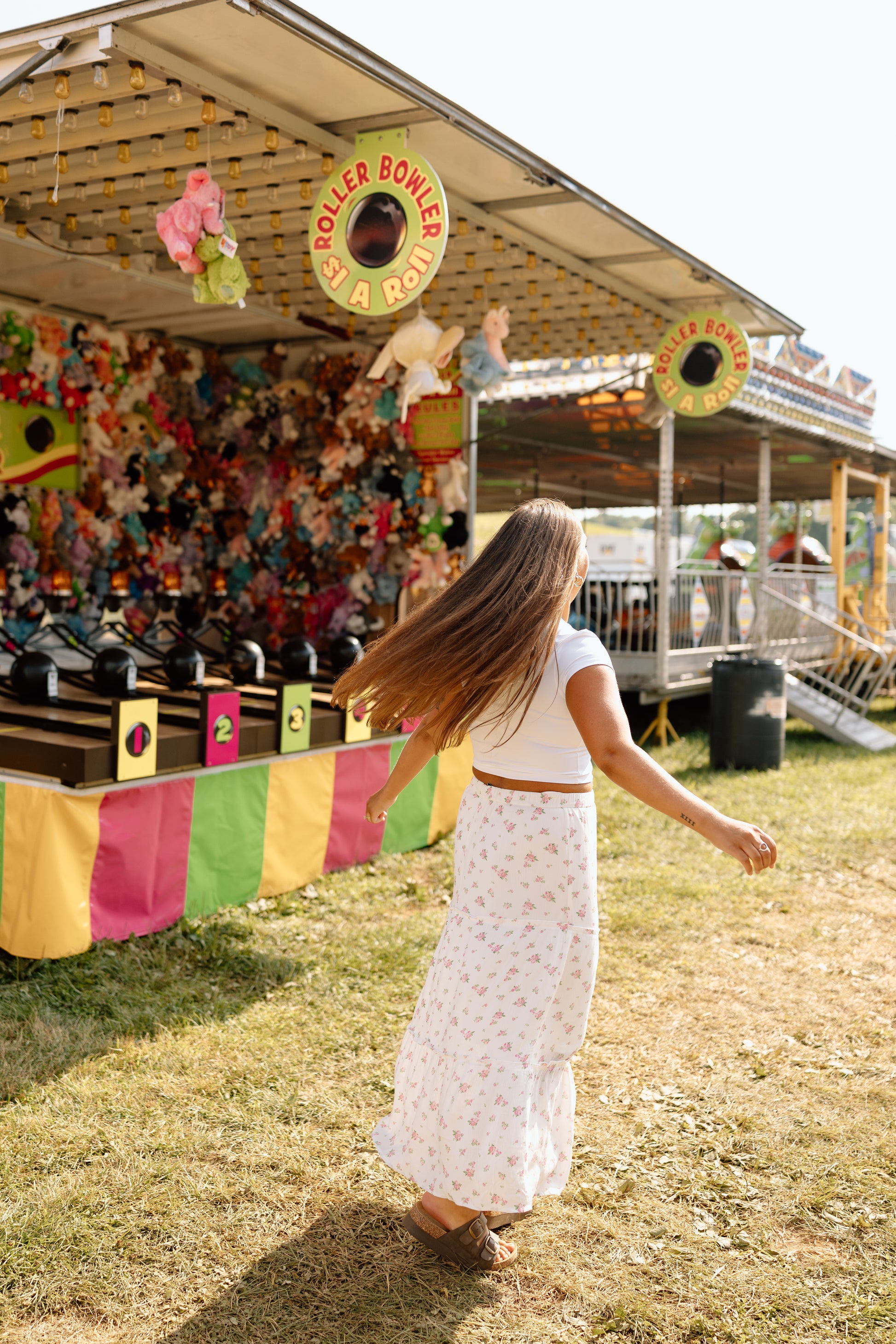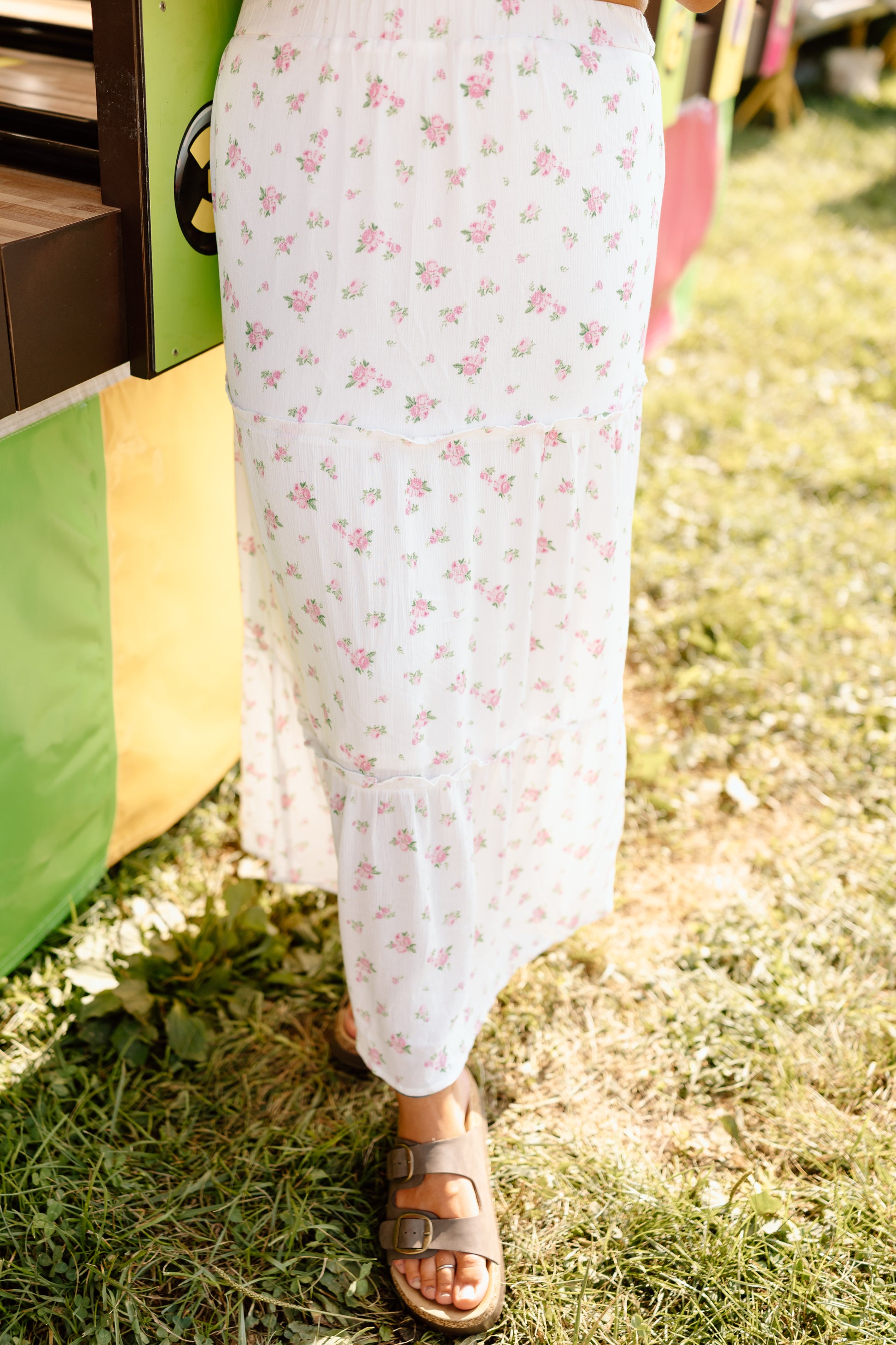 A sweet summer bottom, maxi skirt with elastic waistband and lining. Dainty floral print.